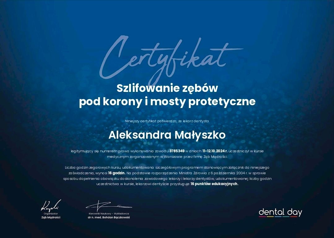 Jaki jest zakres porad oferowanych przez Aleksandra Małyszko?Aleksandra Małyszko to stomatolog. Na podstawie swojego doświadczenia i wykształcenia Aleksandra Małyszko oferuje usługi takie jak: badanie RTG, badania stomatologiczne, konsultacja protetyczna, leczenie próchnicy, stomatologia estetyczna, Wybielanie zębów, Stomatologia zachowawcza, Konsultacja stomatologiczna, diagnostyka RTG/CBCT, Endodoncja mikroskopowa.
