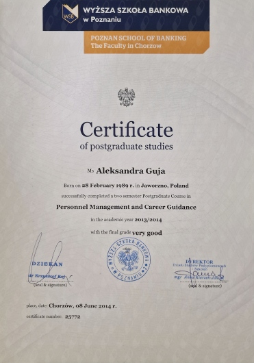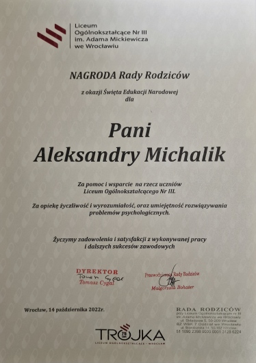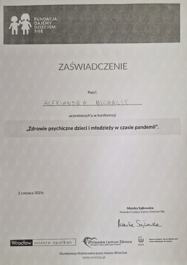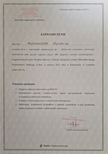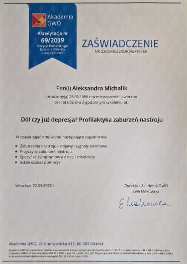 Nazywam się Aleksandra Michalik. Ukończyłam psychologię o specjalnościach klinicznej i sądowej na Uniwersytecie Śląskim w Katowicach. Jestem psychologiem w trakcie czteroletniej Szkoły Psychoterapii Crescentia (3 rok), rekomendowanej przez Polskie Towarzystwo Terapii Poznawczo-Behawioralnej, do którego należę. Aby nieustannie podnosić swoje kompetencje, uczestniczę w szkoleniach i konferencjach poświęconych pracy terapeutycznej. Moje wykształcenie obejmuje również studia podyplomowe z psychologii transportu na Uniwersytecie Jagiellońskim oraz z zarządzania zasobami ludzkimi i doradztwa zawodowego w Wyższej Szkole Bankowej w Chorzowie. Dodatkowo ukończyłam studia podyplomowe z przygotowania pedagogicznego dla psychologów na Dolnośląskiej Szkole Wyższej, co pozwala mi lepiej zrozumieć potrzeby oraz wyzwania, przed którymi stają młodzi ludzie. Doświadczenie zawodowe zdobywałam m.in. na Oddziale Psychiatrycznym w Sosnowcu, w Ośrodku Interwencji Kryzysowej oraz w Miejskim Ośrodku Pomocy Społecznej w Dąbrowie Górniczej. Pracowałam także w Terapeutycznym Punkcie Przedszkolnym dla Dzieci z zaburzeniami ze spektrum autyzmu we Wrocławiu oraz jako psycholog w III Liceum Ogólnokształcącym we Wrocławiu, gdzie wspierałam młodzież w trudnym okresie dorastania. Doświadczenie w pracy indywidualnej z dorosłymi i nastolatkami zdobywałam także w ramach prywatnej praktyki, pomagając osobom z zaburzeniami lękowymi, nastroju, osobowości oraz przechodzącym przez różnego rodzaju kryzysy życiowe, takie jak żałoba czy rozstanie. W swojej pracy terapeutycznej posługuję się przede wszystkim podejściem poznawczo-behawioralnym, którego skuteczność potwierdzają solidne dowody naukowe. Ten nurt zakłada, że myśli, emocje, zachowania i reakcje fizjologiczne pozostają ze sobą w ścisłej interakcji. Podczas sesji wspólnie z pacjentem analizujemy jego myśli, uczucia i zachowania, co umożliwia identyfikację nieadaptacyjnych wzorców oraz wprowadzenie skutecznych interwencji. Prowadzi to do redukcji nasilenia objawów, poprawy jakości życia oraz zwiększenia satysfakcji z codziennego funkcjonowania. Zakres prowadzonej przeze mnie terapii obejmuje m.in.: -Zaburzenia lękowe (fobie, fobia społeczna, uogólnione zaburzenia lękowe, ataki paniki, zaburzenia obsesyjno-kompulsyjne) -Zaburzenia nastroju (depresja, obniżony nastrój, zaburzenia adaptacyjne) -Zaburzenia snu (bezsenność, trudności w zasypianiu, brak satysfakcji ze snu) -Zaburzenia odżywiania (anoreksja, bulimia) -Zaburzenia neurorozwojowe (ADHD, zaburzenia ze spektrum autyzmu) -Kryzysy życiowe (żałoba, emigracja, rozwód/rozstanie, trudności w komunikacji, samotność, trudności w znalezieniu partnera/ki, myśli samobójcze, utrata sensu życia) -Rozwój osobisty (asertywność, odporność psychiczna, pewność siebie, regulacja emocji, radzenie sobie ze stresem) Pierwsza sesja ma charakter konsultacyjny i służy wzajemnemu poznaniu oraz weryfikacji, czy obie strony czują się w relacji komfortowo. Bezpieczeństwo i zaufanie są kluczowe, gdyż poruszane będą kwestie ważne i często trudne emocjonalnie. Na początku spotkania ustalimy, czy jest to Twój pierwszy kontakt ze specjalistą ds. zdrowia psychicznego i omówimy zasady pracy, w tym kwestie poufności. Zadam także kilka pytań dotyczących Twojej historii życiowej (rodzina, edukacja, związki) oraz historii chorób w rodzinie, mogących mieć wpływ na Twoją obecną sytuację. Pod koniec konsultacji poproszę Cię o przemyślenie celów, jakie chcesz osiągnąć w terapii – będzie to pierwsze „zadanie domowe” do omówienia na kolejnej sesji. W zależności od potrzeb pacjenta, etap konsultacji może trwać kilka spotkań przed rozpoczęciem właściwej terapii. Przyjmuję pacjentów dorosłych oraz młodzież i dzieci od 13. roku życia. W swojej praktyce kieruję się zasadami zawartymi w Kodeksie Etycznym Psychologa, regularnie korzystam z superwizji oraz dbam o swój stały rozwój, aby zapewnić jak najwyższą jakość świadczonej pomocy.
