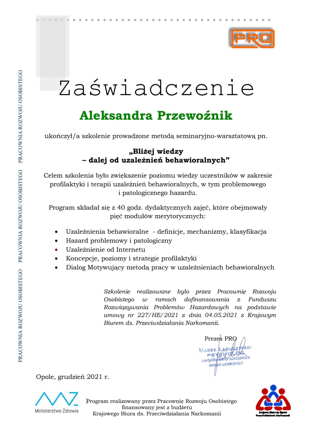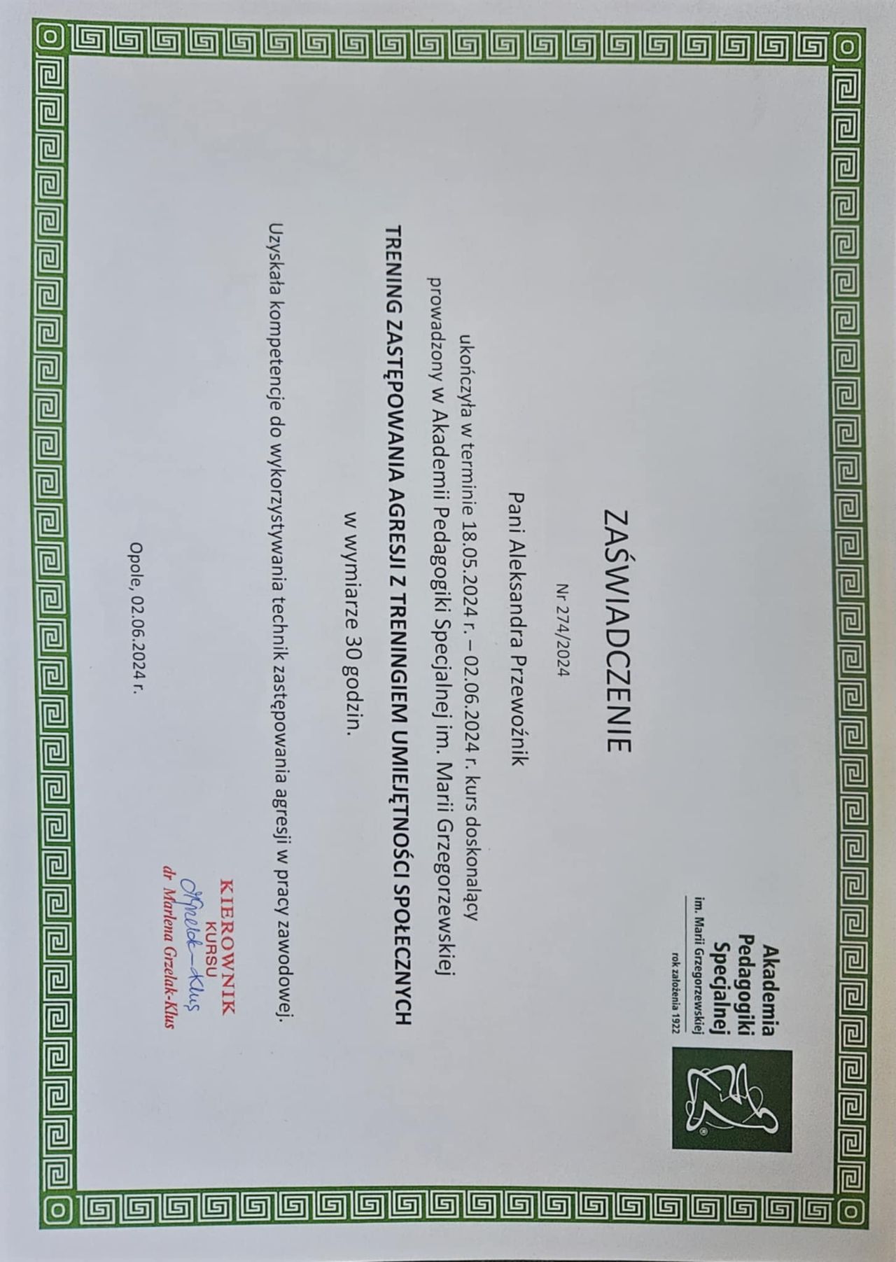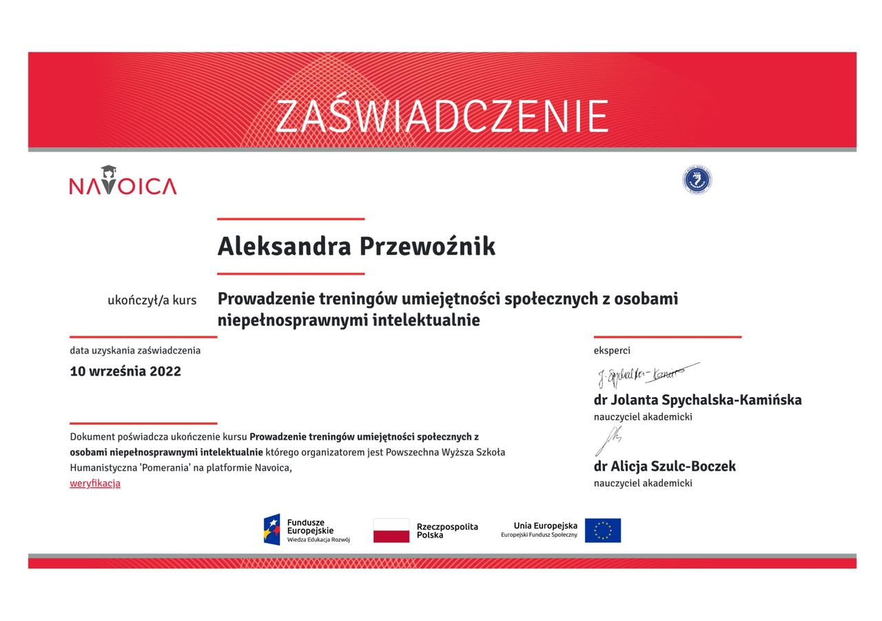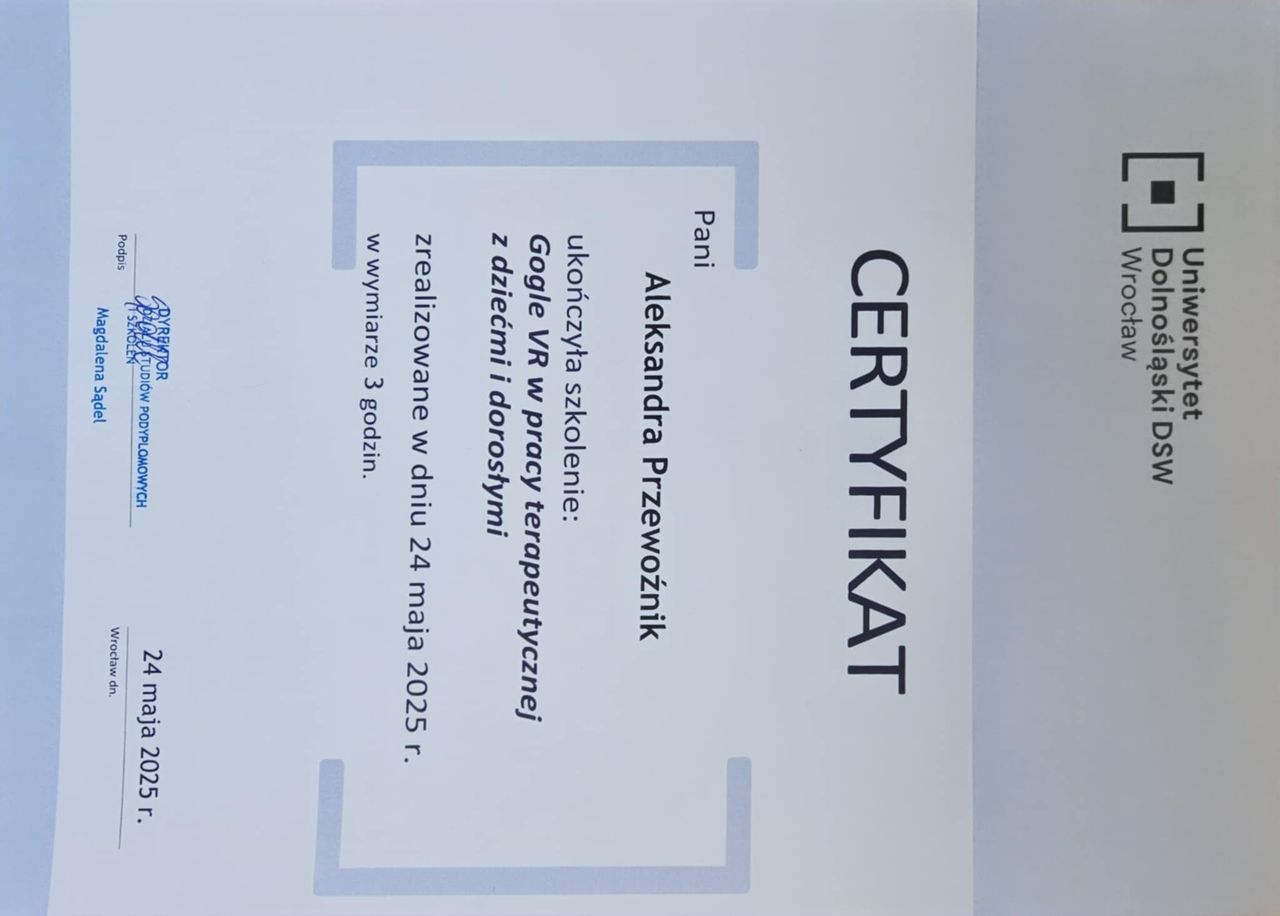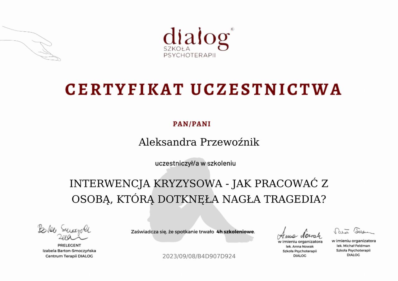 Ukończyłam również certyfikowane szkolenie z zakresu Terapii Skoncentrowanej na Rozwiązaniach (TSR) – podejścia, które koncentruje się na poszukiwaniu możliwych rozwiązań, a nie wyłącznie na analizie problemów. TSR zakłada, że każdy człowiek posiada zasoby i mocne strony, które mogą wspierać go w procesie zmiany.