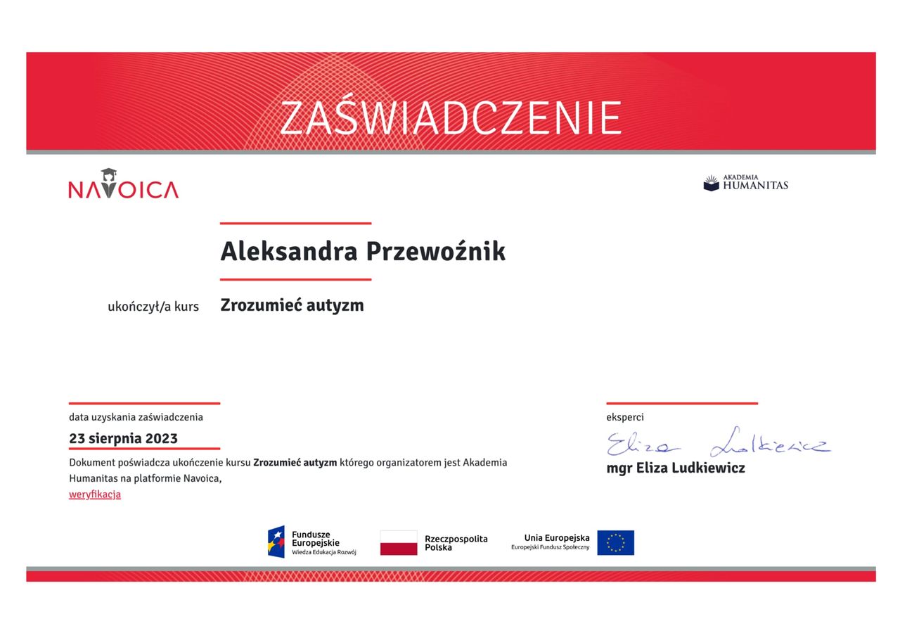 Jestem psychologiem z doświadczeniem w pracy z dziećmi i młodzieżą, zdobywanym zarówno w Polsce, jak i za granicą. Ukończyłam studia psychologiczne na Uniwersytecie Opolskim, a swoją wiedzę pogłębiam na kierunku psychotraumatologia na Uniwersytecie Dolnośląskim DSW we Wrocławiu. Posiadam również przygotowanie pedagogiczne. Na co dzień pracuję jako psycholog w przedszkolu i szkole.