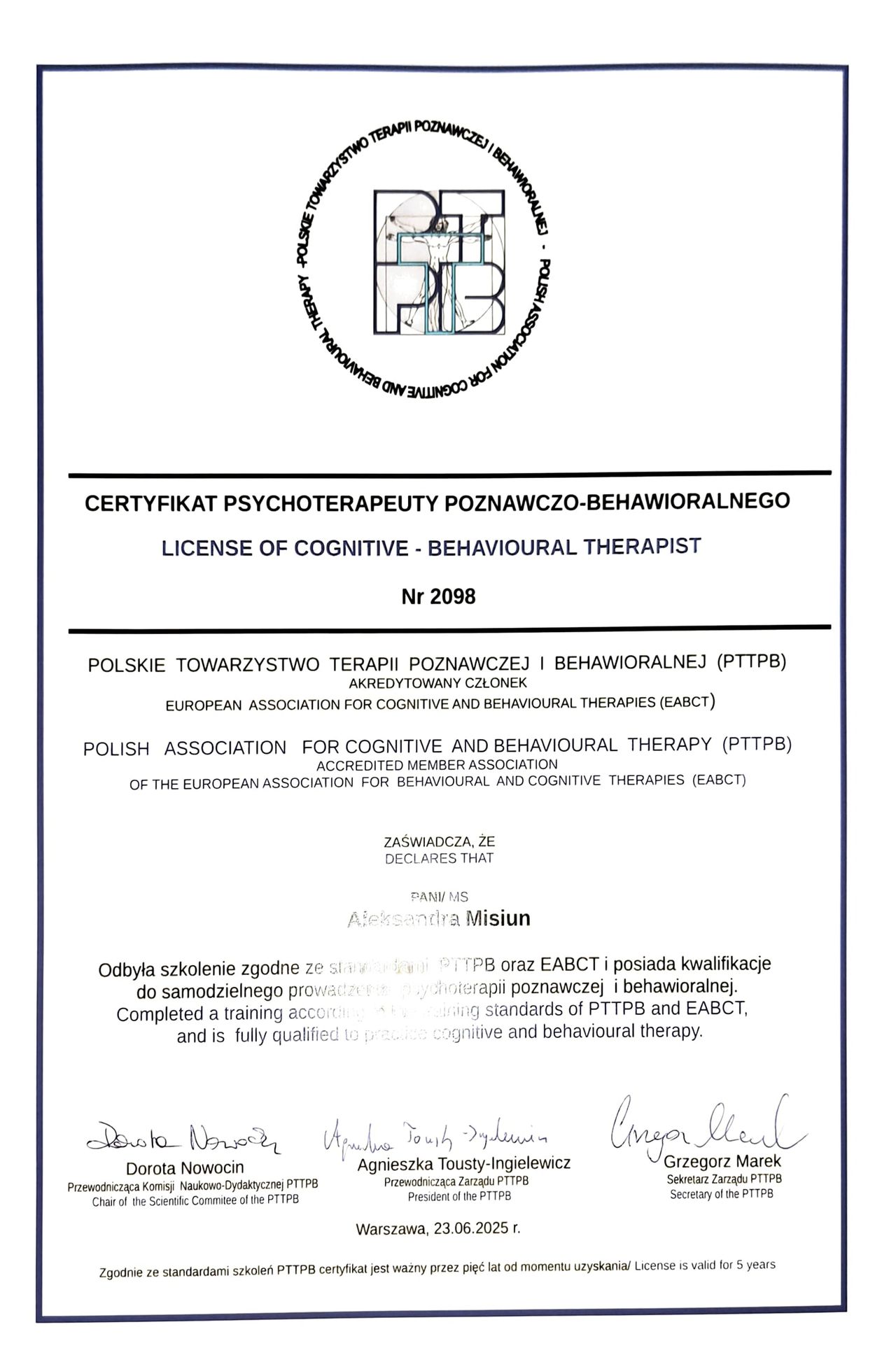 Jestem członkinią Polskiego Towarzystwa Terapii Poznawczo-Behawioralnej oraz Polskiego Towarzystwa Terapii Dialektywno-Behawioralnej.