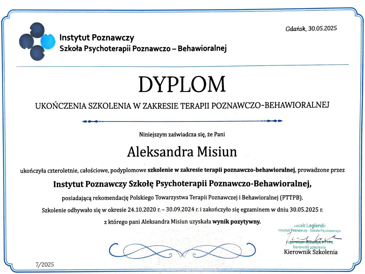 Chciałbym serdecznie podziękować za cały przebyty proces terapeutyczny. Terapia pod kierunkiem Pani Aleksandry była dla mnie niezwykle wartościowym i wspierającym doświadczeniem. Czułem się wysłuchany, zrozumiany i prowadzony z dużym wyczuciem oraz profesjonalizmem.