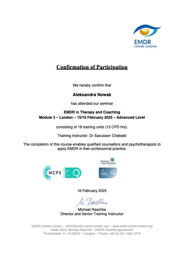Uczestniczę w 3 superwizjach miesięcznie. Superwizja jest to miejsce spotkań gdzie rozmawia się o trudnościach i przeszkodach w terapii za uprzednią zgodą klienta, po to aby usprawnić proces terapii i wybierać najbardziej dopasowane sposoby pomocy, innymi słowami, by tworzyć program pomocy dla klienta "szyty na miarę" uwzględniając jego temperament i historią życiową. Moje superwizje odbywają się w terapii poznawczo-behawioralnej i schematów. Ciągły rozwój jako terapeuta sprawia mi bardzo dużą przyjemność, gdyż dzięki niej mogę pomagać klientom w skuteczny sposób z coraz to bardziej złożonymi trudnościami i skomplikowanymi historiami życiowymi.