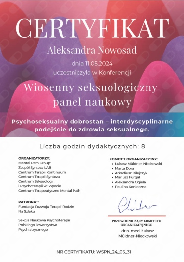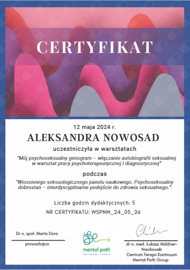 Ukończyłam także seksuologię kliniczną na Uniwersytecie SWPS w Warszawie oraz studia podyplomowe z przygotowania pedagogicznego.
