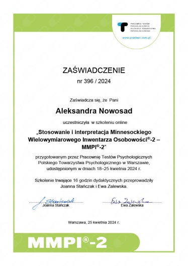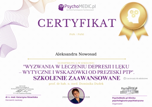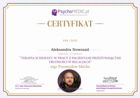 Jestem psycholożką, seksuolożką i psychoterapeutką poznawczo-behawioralną w trakcie szkolenia w Instytucie Poznawczym - akredytowanej szkole terapii poznawczo-behawioralnej.