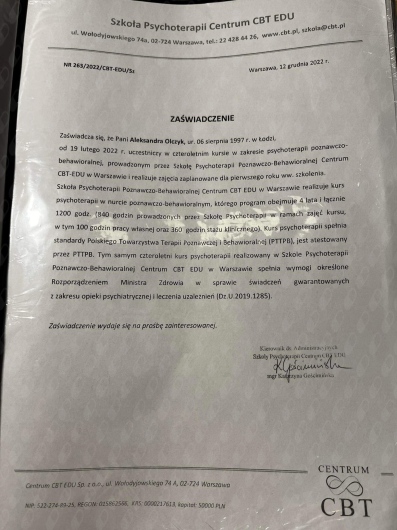 Centrum CBT-EDU w Warszawie, które posiada rekomendację Polskiego Towarzystwa Terapii