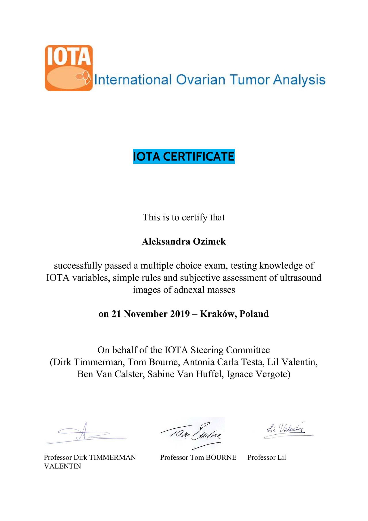 Wykonuję badania ultrasonograficzne narządu rodnego zgodnie z rekomendacjami Polskiego Towarzystwa Ginekologów i Położników. Posiadam także międzynarodowy certyfikat International Ovarian Tumour Analysis (IOTA) poświadczający umiejętności w diagnostyce guzów jajnika i narządu rodnego.