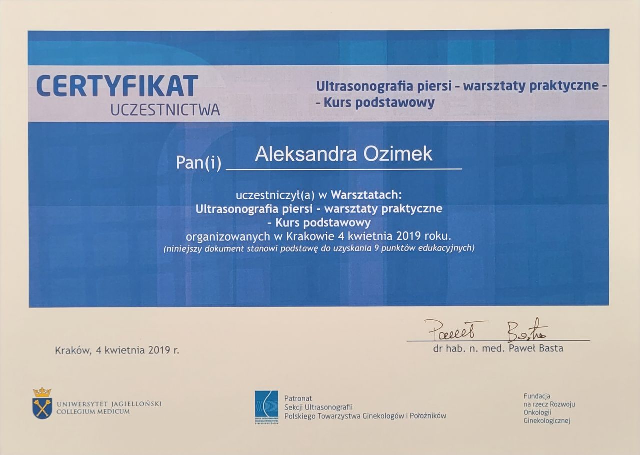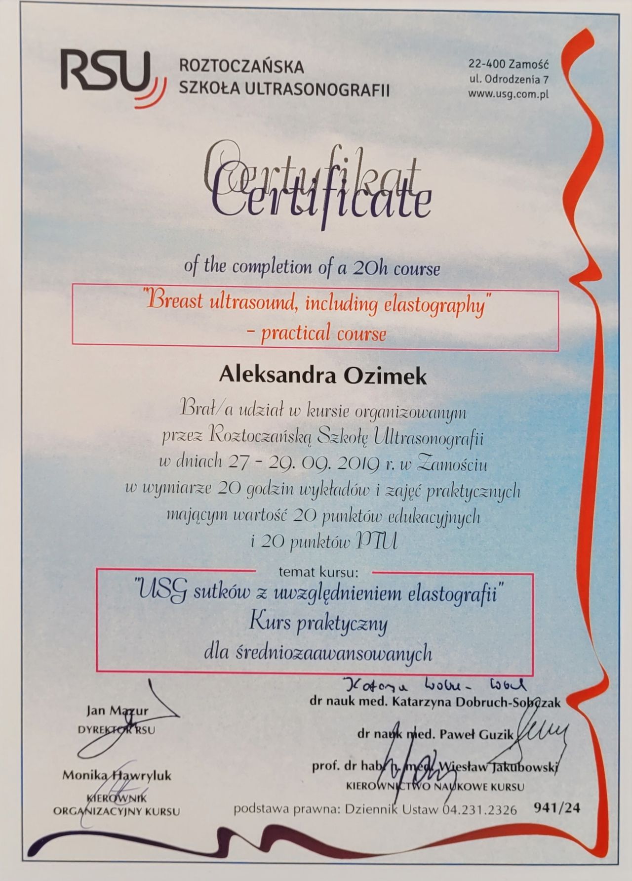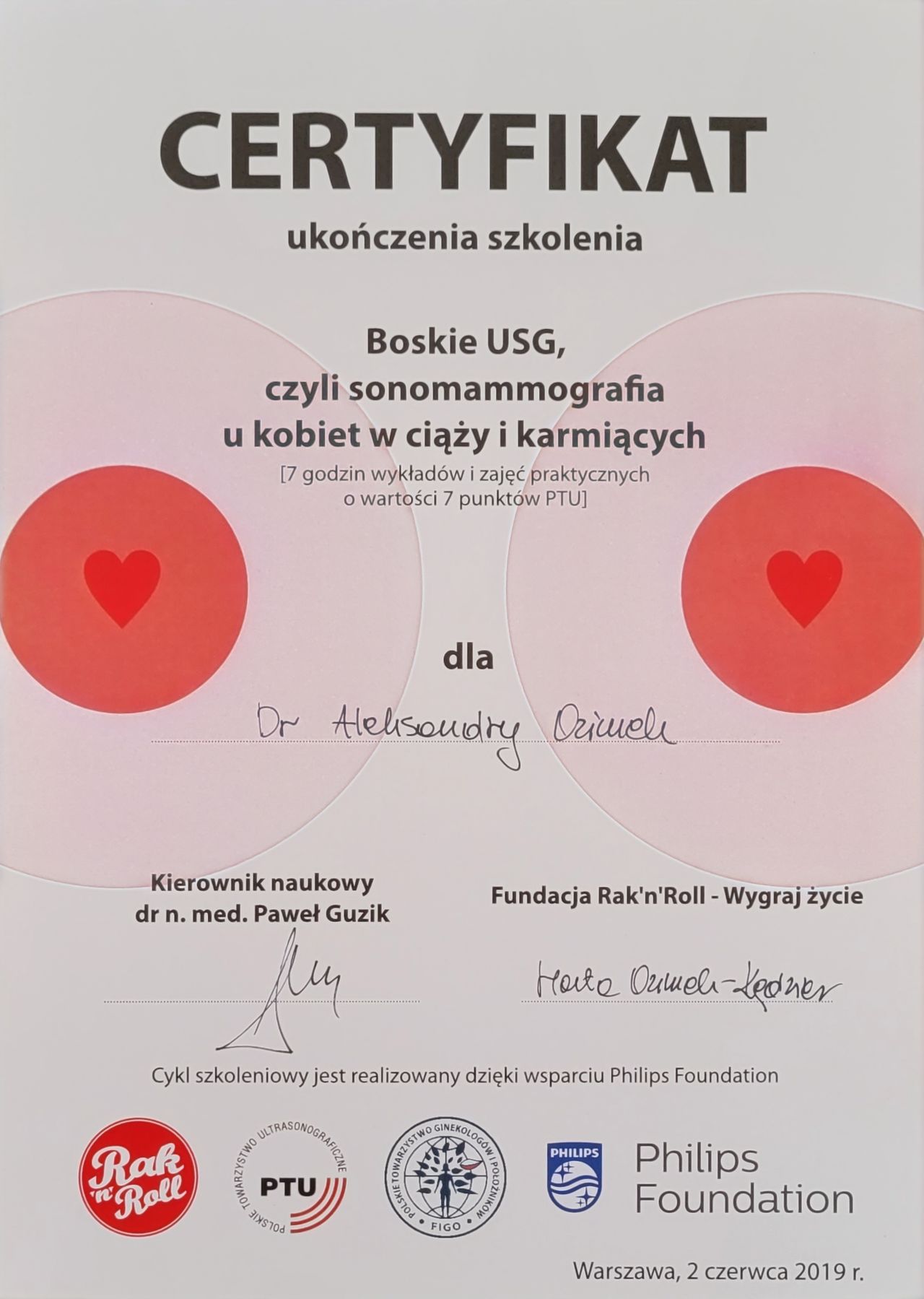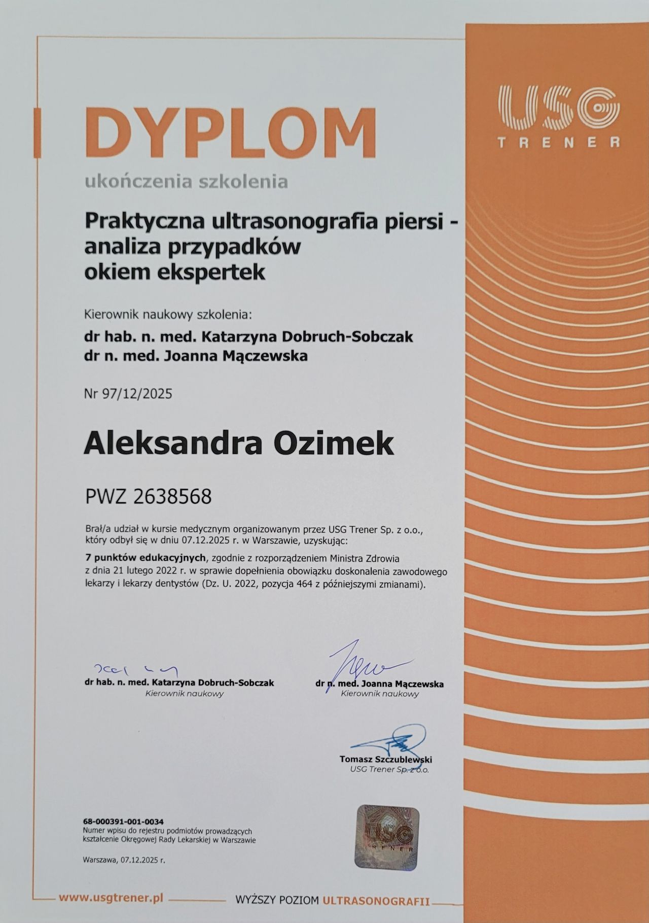 Moje zawodowe zainteresowania skupiają się również na diagnostyce i leczeniu chorób piersi. Od początku mojej pracy zawodowej to właśnie diagnostyka chorób piersi interesuje mnie szczególnie. Od roku 2019 roku jestem certyfikowaną ultrasonografistką Polskiego Towarzystwa Ginekologów i Położników w zakresie wykonywania USG piersi.