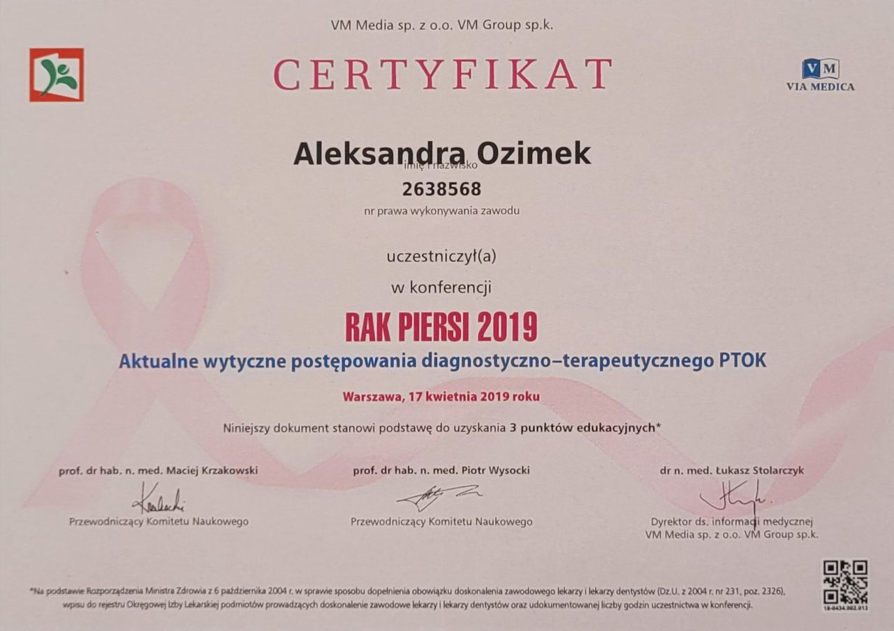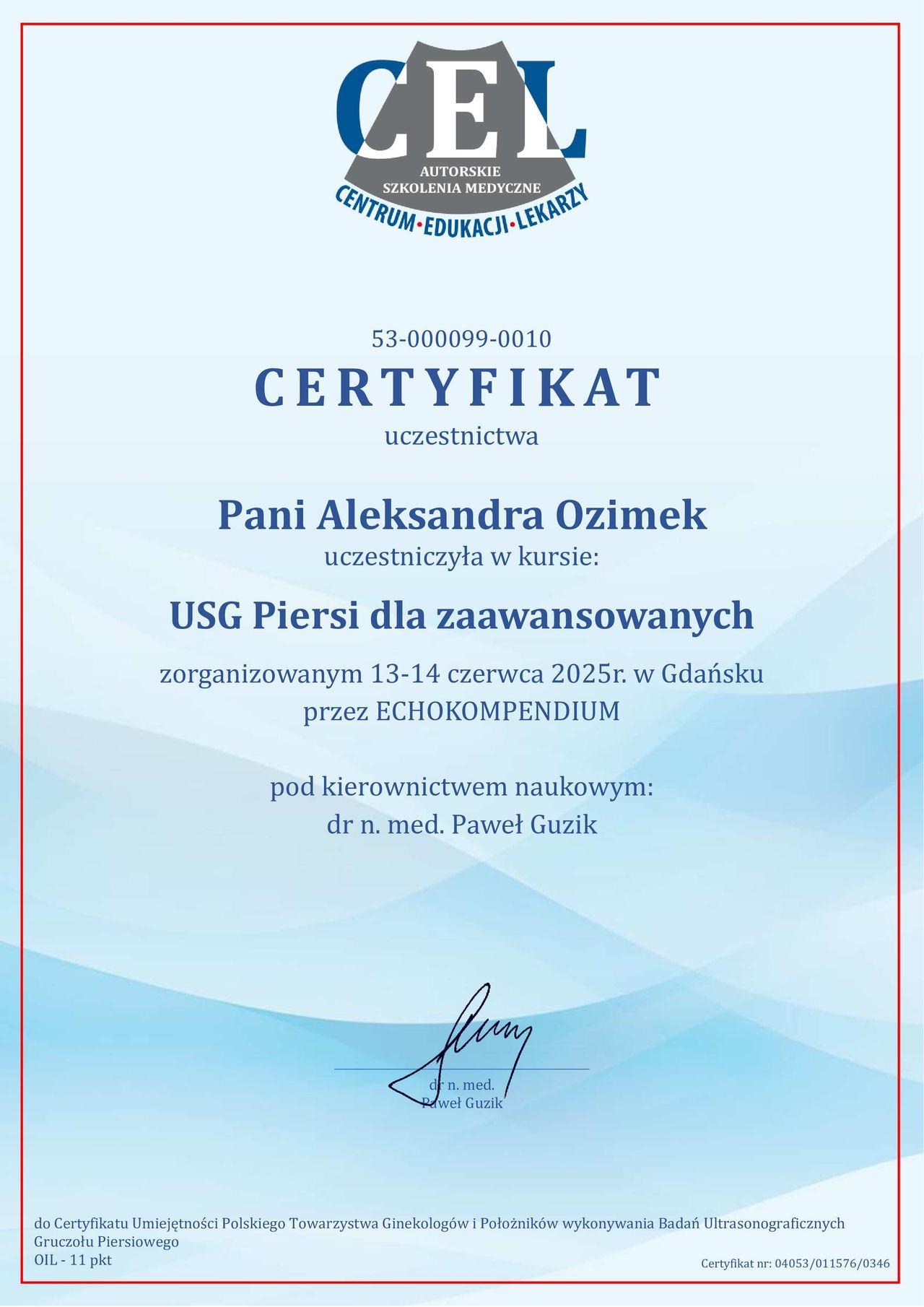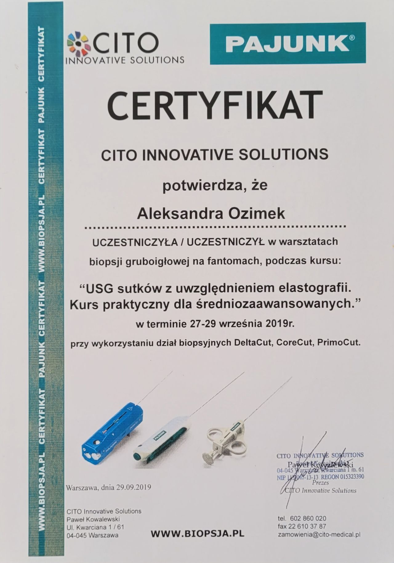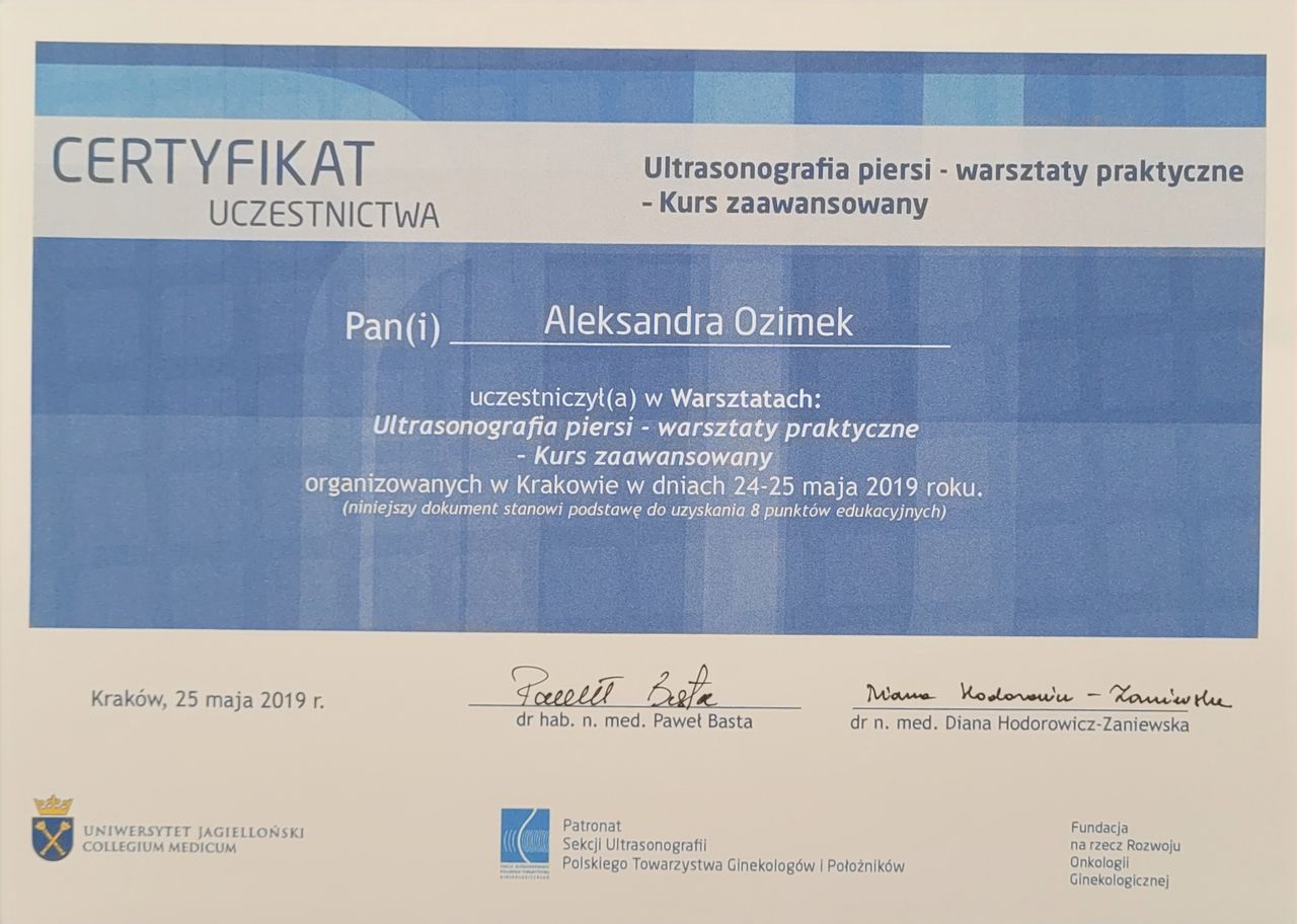 Moje zawodowe zainteresowania skupiają się również na diagnostyce i leczeniu chorób piersi. Od początku mojej pracy zawodowej to właśnie diagnostyka chorób piersi interesuje mnie szczególnie. Od roku 2019 roku jestem certyfikowaną ultrasonografistką Polskiego Towarzystwa Ginekologów i Położników w zakresie wykonywania USG piersi.