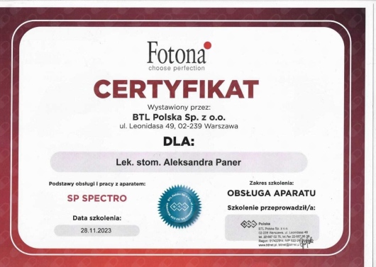 Jaki jest zakres porad oferowanych przez Aleksandra Paner?Aleksandra Paner to stomatolog, lekarz wykonujący zabiegi medycyny estetycznej. Na podstawie swojego doświadczenia i wykształcenia Aleksandra Paner oferuje usługi takie jak: wypełnienie kompozytowe, opatrunek leczniczy, znieczulenie miejscowe, Rekonstrukcja zęba, fluoryzacja zębów, Konsultacja stomatologiczna, Odbudowa zęba na włóknie szklanym, wizyta w związku z bólem zęba, odbudowa zębów, profilaktyka próchnicy.