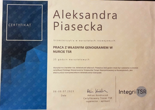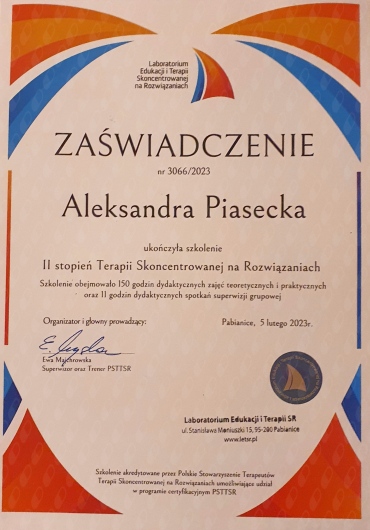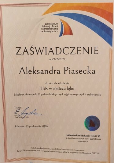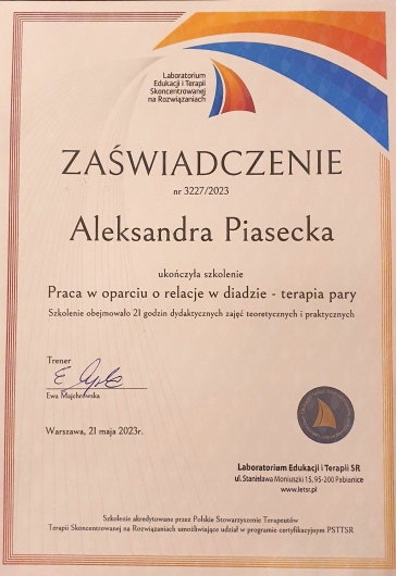 Odbyłam szkolenia z: lęku, depresji, interwencji kryzysowej, terapii par, genogramu, racjonalnej terapii zachowania (RTZ), ADHD, spektrum autyzmu, OCD w ADHD i ASD, skutecznej pracy z ADHD i ASD, seksualności osób neuroatypowych, neuroatypowość a zaburzenia osobowości, warsztatu rozwoju seksualności własnej, wywiadu i diagnozy psychologicznej, psychoseksualnego self w pracy terapeutycznej, zaburzeń libido u osób indywidualnych oraz par, modelu PLISSIT, zaburzeń bólowych u kobiet, relacji partnerskiej w obliczu zdrady, niedopasowania seksualnego u par, treningu seksualnego, gadżetów erotycznych, związków poligamicznych i fetyszy seksualnych, parafilii, dysforii płciowej, zaburzeń erekcji oraz wytrysku przedwczesnego, opóźnionego i bólowego.