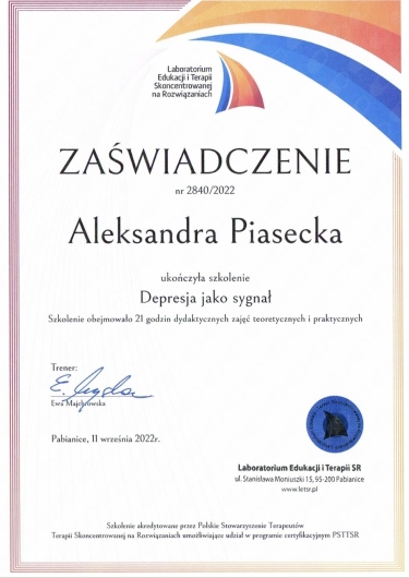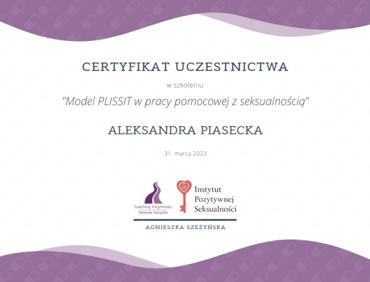 Ukończyłam studia psychologiczne na dwóch specjalnościach – psychoterapia par oraz terapia seksualna, a także psychologia kliniczna. Dodatkowo studia podyplomowe z seksuologii klinicznej, których opiekunem merytorycznym był prof. dr hab. Zbigniew Lew – Starowicz. Zdobyłam oba stopnie szkolenia terapeutycznego z Terapii Skoncentrowanej na Rozwiązaniach, które poszerzyły moje kwalifikacje zawodowe o umiejętność pracy krótkoterminowej. Brałam również udział w szkoleniach organizowanych przez Instytut Pozytywnej Seksualności. Pracuję w oparciu o Terapię Schematów.