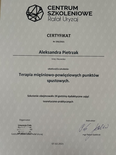 Jestem absolwentką Akademii Wychowania Fizycznego im. Jerzego Kukuczki w Katowicach. W swojej pracy głównie otaczam opieką pacjentki z dolegliwościami uroginekologicznymi na każdym etapie życia. Pracuje również z pacjentami ortopedycznymi, z przewlekłym bólem czy po urazach i zabiegach. Stale staram poszerzać swoją wiedzę na licznych szkoleniach, takich jak: