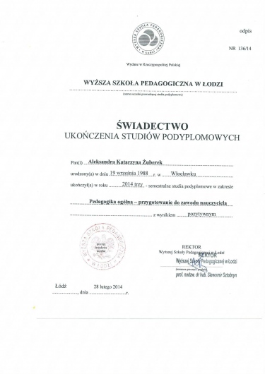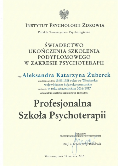 Jestem absolwentką studiów magisterskich z psychologii na Wydziale Nauk o Wychowaniu w Łodzi i dyplomowaną psychoterapeutką, pracuję z ludźmi od 2012 roku, prowadzę terapię od 2013 r. Ukończyłam czteroletnie studia podyplomowe w Profesjonalnej Szkole Psychoterapii w ramach Instytutu Psychologii Zdrowia w Warszawie w 2017 r.