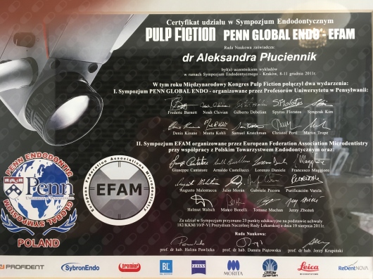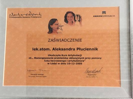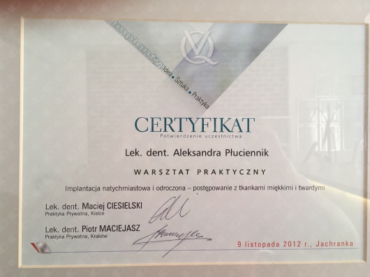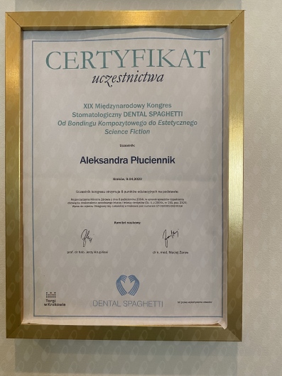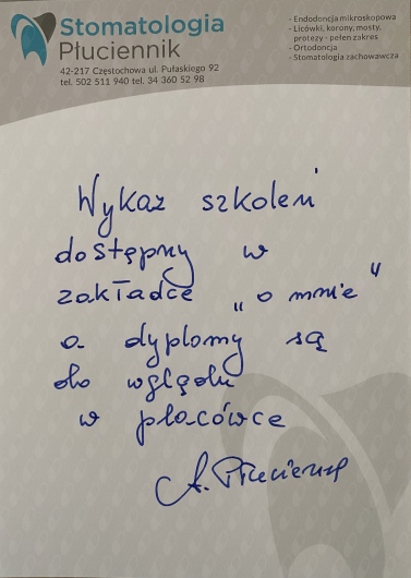 WYKAZ SZKOLEŃ (1997-2022) Dyplomy są dostępne do wglądu w placówce 1-Stomatologia estetyczna -teoria i praktyka 12.04.1997 SPLD WARSZAWA 2-Protetyka w praktyce 6.12.1997 TYCHY 3-Zasady wykonywania protez stałych . Korona lana i licowana porcelaną 26.04.1998 WARSZAWA 4-Powikłania i błędy w leczeniu endodontycznym i protetycznym 16.01.1999 SPLD WARSZAWA 5-Korony kosmetyczne szlifowanie i metody wyciskowe 12.06.1999 SPLD WARSZAWA 6-Leczenie urazów uszkodzeń zębów u dzieci 23.05 1999 SPLD WARSZAWA 7- VII ZJAZD ZESPOŁÓW STOMATOLOGICZNYCH CEDE 13-15.09.2001 ŁÓDŻ 8-Periodontologia klasyczna 20.09.2002 KRAKÓW 9-VIII ZJAZD ZESPOŁÓW STOMATOLOGICZNYCH CEDE 12-14.09.2002 ŁÓDZ 10-Protetyka - praktycy dla praktyki 12-13.10.2002 POPOWA 11-Zastosowanie szyny NTI w codziennej praktyce stomatologicznej 7.12.2002 KRAKÓW FM 12-Festiwal Stomatologii Praktycznej 16-18.05.2003 DENTOPOLIS ŁÓDZ 13-Najczęstsze współczesne zabiegi stomatologiczne cz.IV 29.11.2003 DENCO WROCŁAW 14-Chirurgia plastyczna przyzębia. Sterowana regeneracja tkanek 18.10.2003 GC CZĘSTOCHOWA 15-Praktyczny kurs skalingu i root planingu 11.01.2003 PERIO XXI KRAKÓW 16-Stany zagrożenia życia i pierwsza pomoc medyczna w stomatologii 14.03.2004 PRO-MED CZĘSTOCHOWA 17-Implantologia,endodoncja i periodontologia - rozwiązania dla codziennej praktyki stomatologicznej 26.06.2004 BIELSKO BIAŁA 18- Idea – Sztuka – Praktyka 12-14.11.2004 KWINTESENCJA WARSZAWA 19-X ZJAZD ZESPOŁÓW STOMATOLOGICZNYCH 11.11.2004 CEDE ŁÓDZ 20-Preparacja zębów pod korony i mosty metalowo – ceramiczne 19.11.2005 DENCO WARSZAWA 21-CRA DENTISTRY 20.03.2004 WARSZAWA SIŁA DIALOGU 19.06.2004 BISICO KRAKÓW 22-XI ZJAZD ZESPOŁÓW STOMATOLOGICZNYCH 10.09.2005 CEDE WARSZAWA 23-Wykorzystanie fotografii w codziennej praktyce stomatologicznej 11.03.2006 DENCO WARSZAWA 24-Mity i rzeczywistość w stomatologii 14.05.2005 VIVADENT WARSZAWA 25-Stomatologia w zapobieganiu efektom starzenia 29.11.2007 PASE WARSZAWA 26-Implanty 2004 krok po kroku 11.11.2004 KWINTESENCJA WARSZAWA 27-Projektowanie i wykonawstwo protez szkieletowych 11.11.2002 KWINTESENCJA WARSZAWA 28-Bóle twarzy i twarzoczaszki wynikające z zaburzeń układu stomatologicznego . Rozpoznawanie i leczenie . Diagnostyka przed leczeniem protetycznym i ortodontycznym 24.XI.2007 DENCO KATOWICE 29-Atraumatyczna implantologia step by step 13.11.2004 KWINTESENCJA WARSZAWA 30- Perioprotetyka i korony teleskopowe .Zajęcia warsztatowe 4.12.2005 ESDENT WROCŁAW 31-Pulpfiction 6 9-12.XII 2004 PROFIDENT 32-Perioprotetyka i korony teleskopowe 2.12.2005 ESDENT WROCŁAW 33-Regeneracja tkanek miękkich i twardych wokół zębów naturalnych 9.04.OSTEOLOGY FOUNDATION KRAKÓW 34-Wizje i rewizje nowoczesnej stomatologii 18.04.2009 KWINTESENCJA WARSZAWA 35-Nowoczesne koncepcje leczenia i zarządzania tkankami przy użyciu techniki sterowanej regeneracją kości i tkanek 10.04.2010 OSTEOLOGY FOUNDATION KRAKÓW 36-Kurs dokształtcający w ramach IV Zjazdu Polskiego Towarzystwa Dysfunkcji Narządu Żucia 21.05.2005 WISŁA 37-Materiały kompozytowe w odbudowie zębów bocznych 3.03.2007 MARKU CZĘSTOCHOWA 38-Wykorzystywanie fotografii w codziennej praktyce stomatologicznej 11.03.2006 DENCO WARSZAWA 39-Szkolenie protetyczne – licówki , włókna szklane 17.11.2007 BISICO CZĘSTOCHOWA 40-Stomatologia dziś i jutro 11.12.2009 ŚIL KATOWICE 41-Warsztaty implantologiczne z użyciem mikrozespoleń firmy SYNTHES 27-28 .11.2010 SYNTHEZ TYCHY 42-Śląska Konferencja Medycyny Estetycznej 18.06.2010 KATOWICE 43-Trafne diagnozowanie oraz proste procedury zachowawcze gwarancją skutecznego leczenia stomatologicznego 30.03.2012 KOL - DENTAL WARSZAWA 44-PODSTAWY IMPLANTOLOGII 5.04.2013 MARKU 45-Jak zlikwidować skutki choroby przyzębia – czyli profilaktyka trzeciorzędowa 23.05.2014 MIP CZĘSTOCHOWA 46- II KONGRESS CERAMISTS NO LIMITS 25-26 .09.2015 ŁODZ 47-DERMAL FILLERS 5 – 6. 12. 2015 WARSZAWA 48-PODAWANIE TOKSYNY BOTULINOWEJ TYP A BOTOX W ZBIEGACH MEDYCYNY ESTETYCZNEJ 5-6 .12. 2015 WARSZAWA 49-POZYSKIWANIE OSOCZA BOGATOPŁYTKOWEGO I MEZOTERAPIA OSOCZEM 5 – 6 .12.2015 WARSZAWA 50-Międzynarodowe Sympozjum Medycyny Estetycznej 17-18 09. 2016 FENICE KATOWICE 51-Przygotowanie chirurgiczne do zabiegu implantacji 27.04 2013 MARKU CZĘSTOCHOWA 52-Implantacja minimalnie inwazyjna . Procedura wszczepienia implantów w celu stabilizacji protez chirurgicznych 19.03.2013 MARKU CZĘSTOCHOWA 53-Preparacja zębów pod korony i mosty metalowo – ceramiczne 01.04.2006 DENCO WARSZAWA 54- Bóle twarzy i twarzoczaszki wynikające z zaburzeń układu stomatologicznego 24.07.2007 DENCO MIKOŁÓW 55-Einstieg in die zahnarziche implantologie 14.02.2009 LEIPZIG 56-Wprowadzenie do procedury implantologii 6.04.2013 MARKU CZĘSTOCHOWA 57-IMPLANTY 9-11.11.2012 KWINTESENCJA JACHRANKA 58-Seminarium specjalistyczne 25.04.2014 KRAKÓW 59-Wprowadzenie w chirurgię periodontologiczną 12.01.2014 KRAKÓW 60-Sedacja wziewna N2O/O2 w stomatologii 05.10.2014 CZĘSTOCHOWA 61-PERIODONTOLOGIA W OGÓLNEJ PRAKTYCE STOMATOLOGICZNEJ 28.02.2015 EURO MEDIC CZĘSTOCHOWA 62-Komunikacja krok po kroku-od wstępnego wywiadu do finału leczenia 30.09. 2017 ŁODZ 63-Estetyczny przydziąsłowy brzeg korony . KLUCZ DO SUKCESU 8.12.2001 SPLS WARSZAWA 64-Kurs artykulacji . Rozwiązywanie problemów okluzyjnych przy pomocy łuku twarzowego i artykulatora 10.12.2005 NATRODENT ŁÓDŻ 64-Implantacja natychmiastowa i odroczona -postępowanie z tkankami miękkimi i twardymi 9.11.2012 JACHRANKA 65-Artykulacja w codziennej praktyce stomatologicznej 8.06.2003 WROCŁAW 65-XXV lat doświadczeń : przewodnik kliniczny estetycznego leczenia implantologicznego 9.11.2012 JACHRANKA 66-Ortodontyczno- periodontologiczne metody leczenia pacjentów dorosłych 21.10.2011 POLORTO CZĘSTOCHOWA 67-Aparaty czynnościowe 12-15.10.2019 ESDENT WROCŁAW 68-Kurs wprowadzający z ortodoncji klinicznej cz 1 26-27.10.2018 POLORTO CZĘSTOCHOWA 11-12.01.2019 POLORTO CZĘSTOCHOWA 14-15.06. 2019 PO