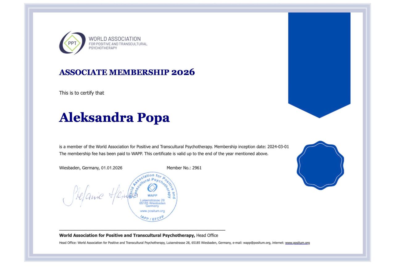 Jestem członkiem Światowego Stowarzyszenia Psychoterapii Pozytywnej i Transkulturowej (WAPP).
