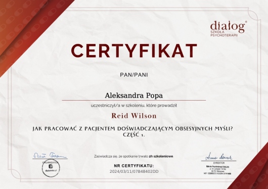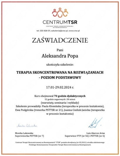 Ukończyłam szkolenie z zakresu Terapii Skoncentrowanej na Rozwiązaniach, podstawowe szkolenie z zakresu Terapii Akceptacji i Zaangażowania (ACT), szkolenie z Psychoterapii opartej na mentalizacji MBT oraz inne szkolenia specjalistyczne.