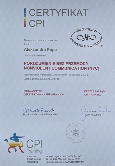 Od wielu lat zgłębiam wiedzę na temat różnych form pomocy i pracy wewnętrznej, m. in.: komunikacji bez przemocy wg. Marshalla Rosenberga, terapii ACT, Mindfulness, Analizy Transakcyjnej.