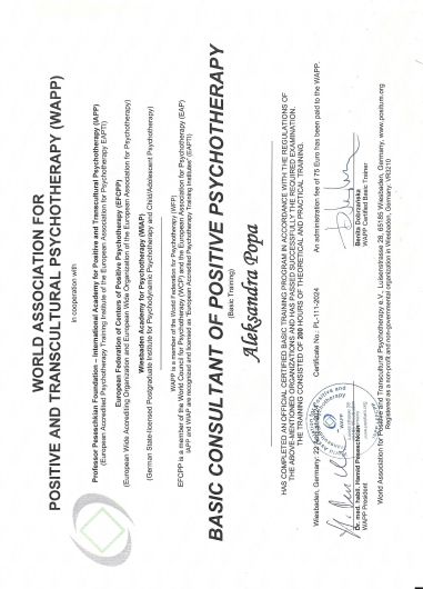 Jestem członkiem Światowego Stowarzyszenia Psychoterapii Pozytywnej i Transkulturowej (WAPP).