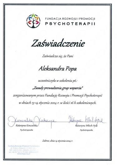 Serdecznie polecam spotkania z Panią Aleksandrą! Profesjonalne wsparcie pełne zrozumienia i akceptacji. Życzę sobie zawsze spotykać na swojej drodze takie osoby!