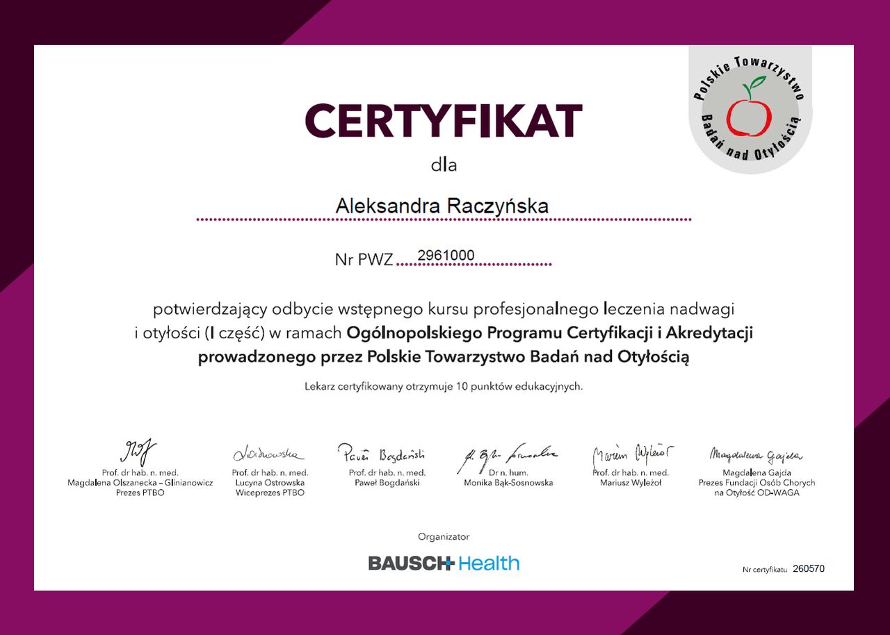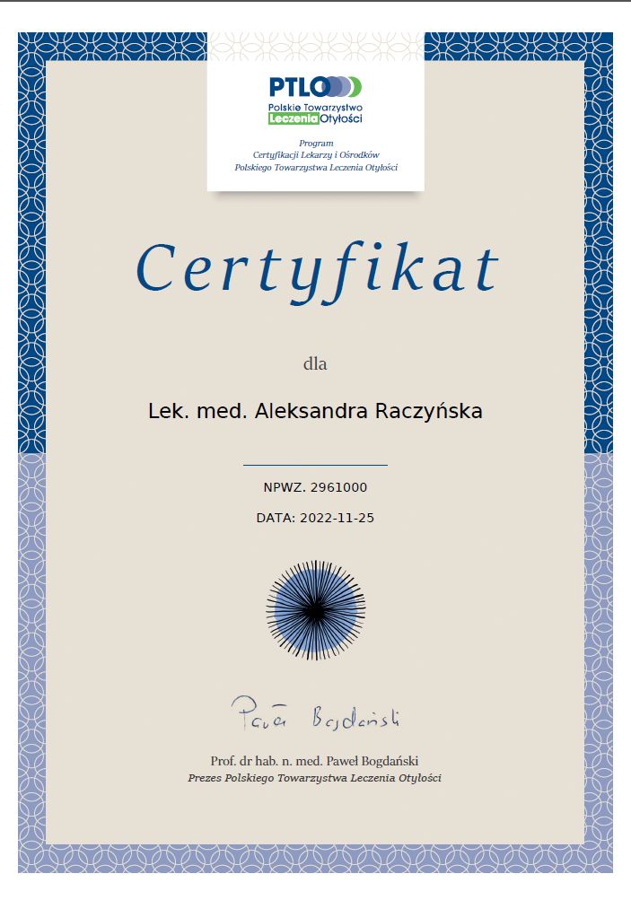 Stale poszerzam swoją wiedzę i doskonalę umiejętności zawodowe, biorąc udział w licznych konferencjach naukowych oraz kursach z zakresu chorób wewnętrznych, diabetologii, obesitologii, dietetyki oraz medycyny stylu życia.