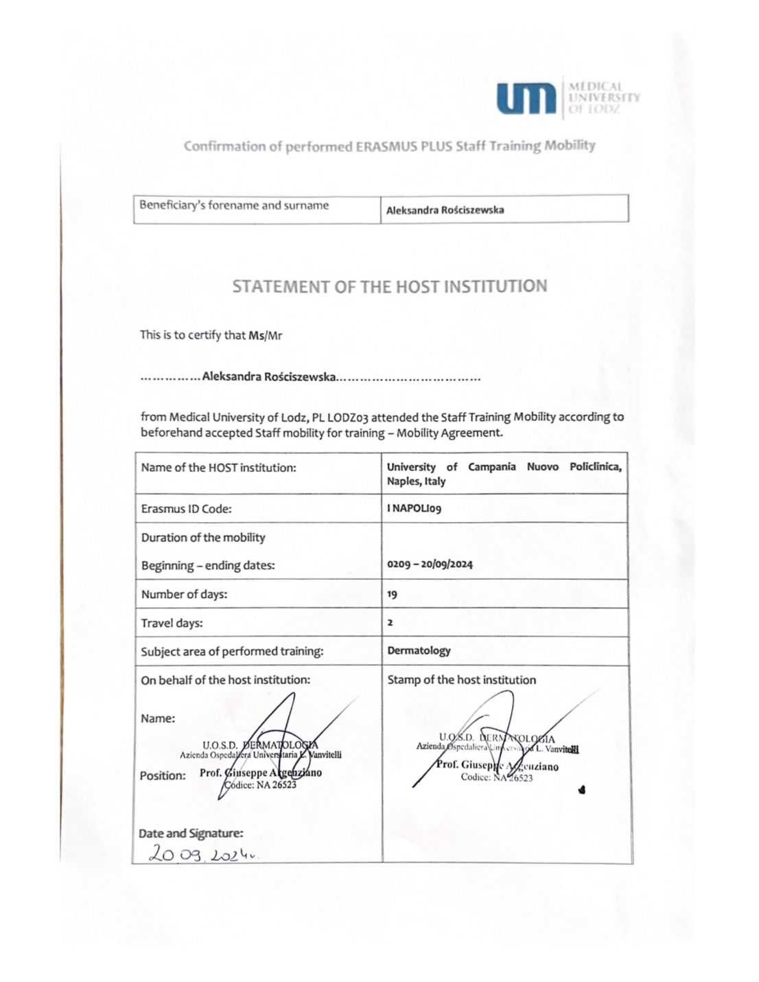 Odbyłam zagraniczny staż szkoleniowy w Klinice jednego z najwybitniejszych światowych ekspertów dermatoskopii — prof. Giuseppe Argenziano w Neapolu — co pozwoliło mi rozwinąć doświadczenie szczególnie w zakresie diagnostyki zmian skórnych.