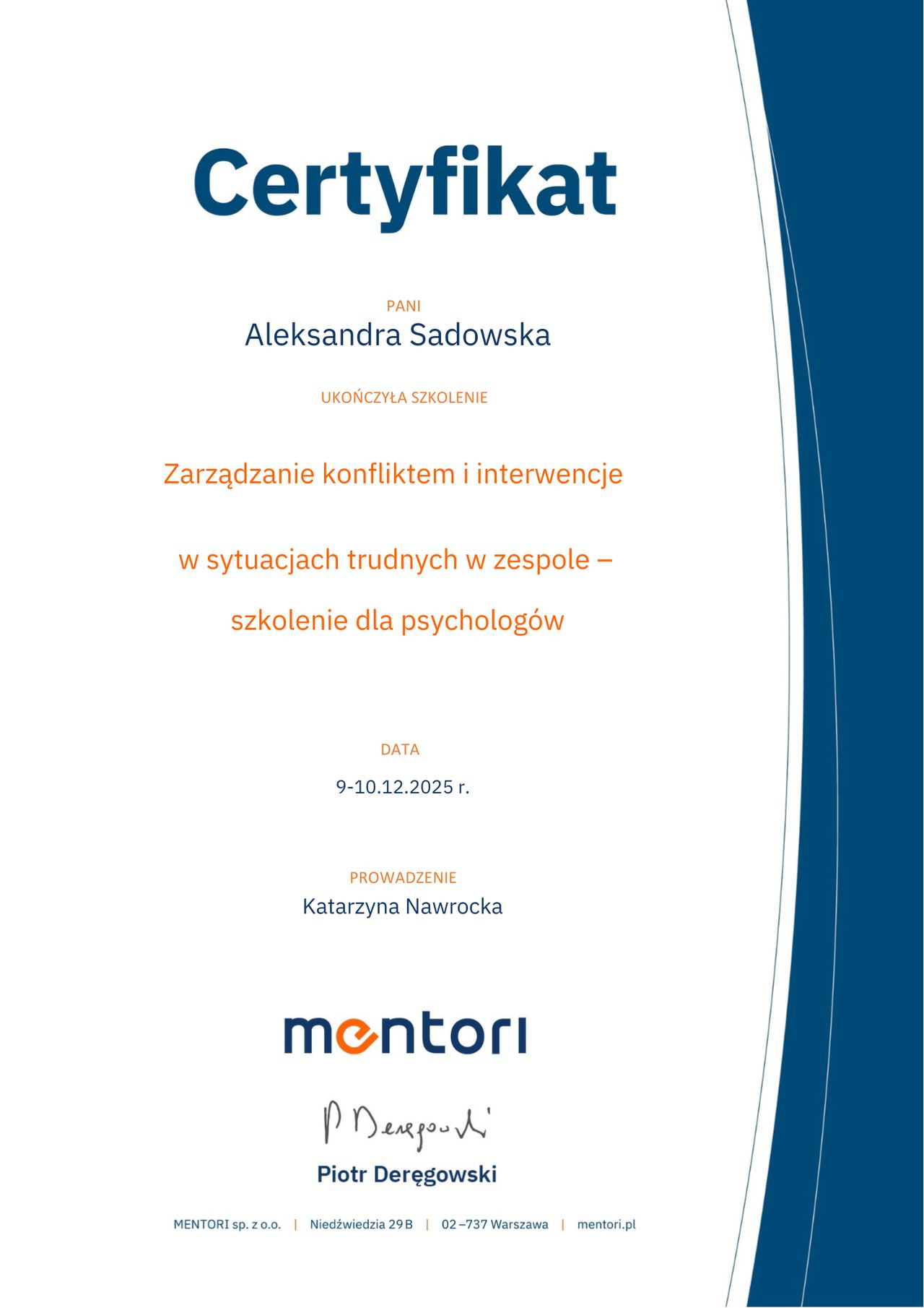 Nazywam się Aleksandra Sadowska, jestem psychologiem oraz psychodietetykiem - pasjonatką odkrywania potencjału na wszelkich możliwych płaszczyznach. Jestem również autorką podcastu dla kobiet - MamCast. Obszary którymi się zajmuje: problemy w obszarze rodzic-dziecko, również te żywieniowe, zaburzenia odżywiania, wsparcie dla kobiet w ciąży oraz młodych mam (baby blues) jeśli masz problem z innym aspektem niż te wymienione powyżej zapytaj, być może również mogę Ci pomóc Studia to jedno, ale dla mnie najważniejsze było praktyczne odkrywanie fascynujących mnie obszarów, w wyniku czego skończyłam specjalizacje z biznesu, coachingu oraz psychoterapii poznawczo-behawioralnej. Ta praca to moja pasja, dlatego każda konsultacja jest dla mnie jak nowa przygoda, a jednocześnie ogromna satysfakcja z osiągnięć/postępów moich podopiecznych. Dlatego jeżeli czujesz, że potrzebujesz konkretnego wsparcia od człowieka, który potrafi być obecny tu i teraz, potrafi słuchać i zadawać trafne pytania, które pozwolą Ci odkryć to co już w sobie masz ale nie zdajesz sobie jeszcze z tego sprawy to koniecznie odezwij się do mnie, znajdziemy dogodny dla Ciebie termin i umówimy się na spotkanie online. Do zobaczenia!