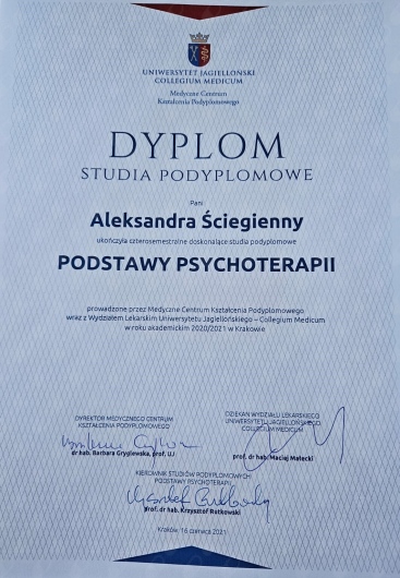 Swoje doświadczenie zdobywałam pracując w Specjalistycznym Centrum Leczenia Dzieci i Młodzieży, w Poradni Zdrowia Psychicznego i Oddziale Dziennym Psychiatrycznym „Psyche” w Scanmed. Uczestniczyłam także w licznych stażach m.in. w Krakowskim Instytucie Psychoterapii Podbrzezie, Oddziale Rehabilitacji Psychiatrycznej w Szpitalu im .J. Babińskiego, w Oddziale Psychiatrii Dzieci i Młodzieży Szpitala Uniwersyteckiego.