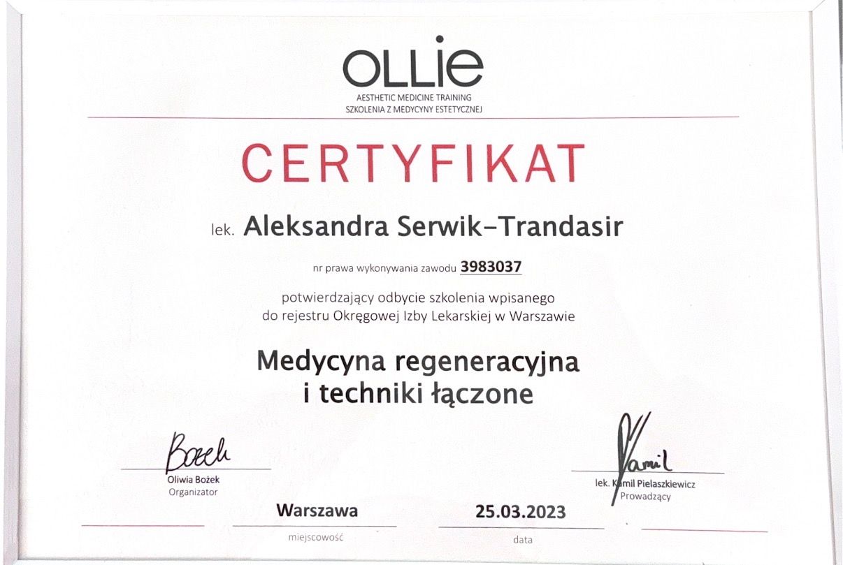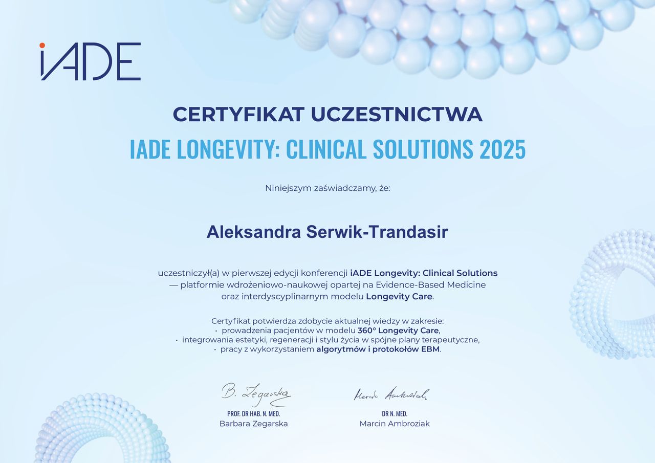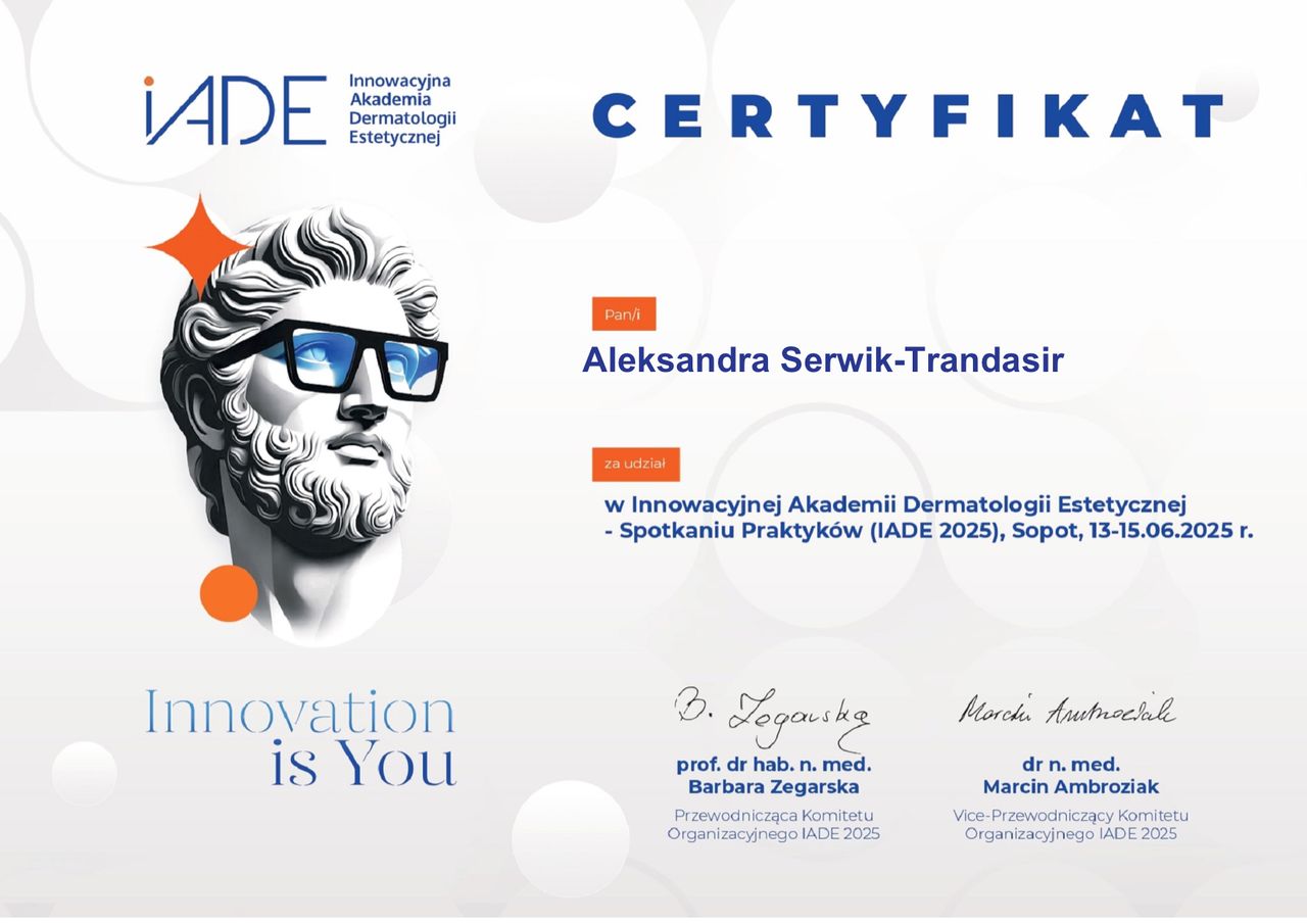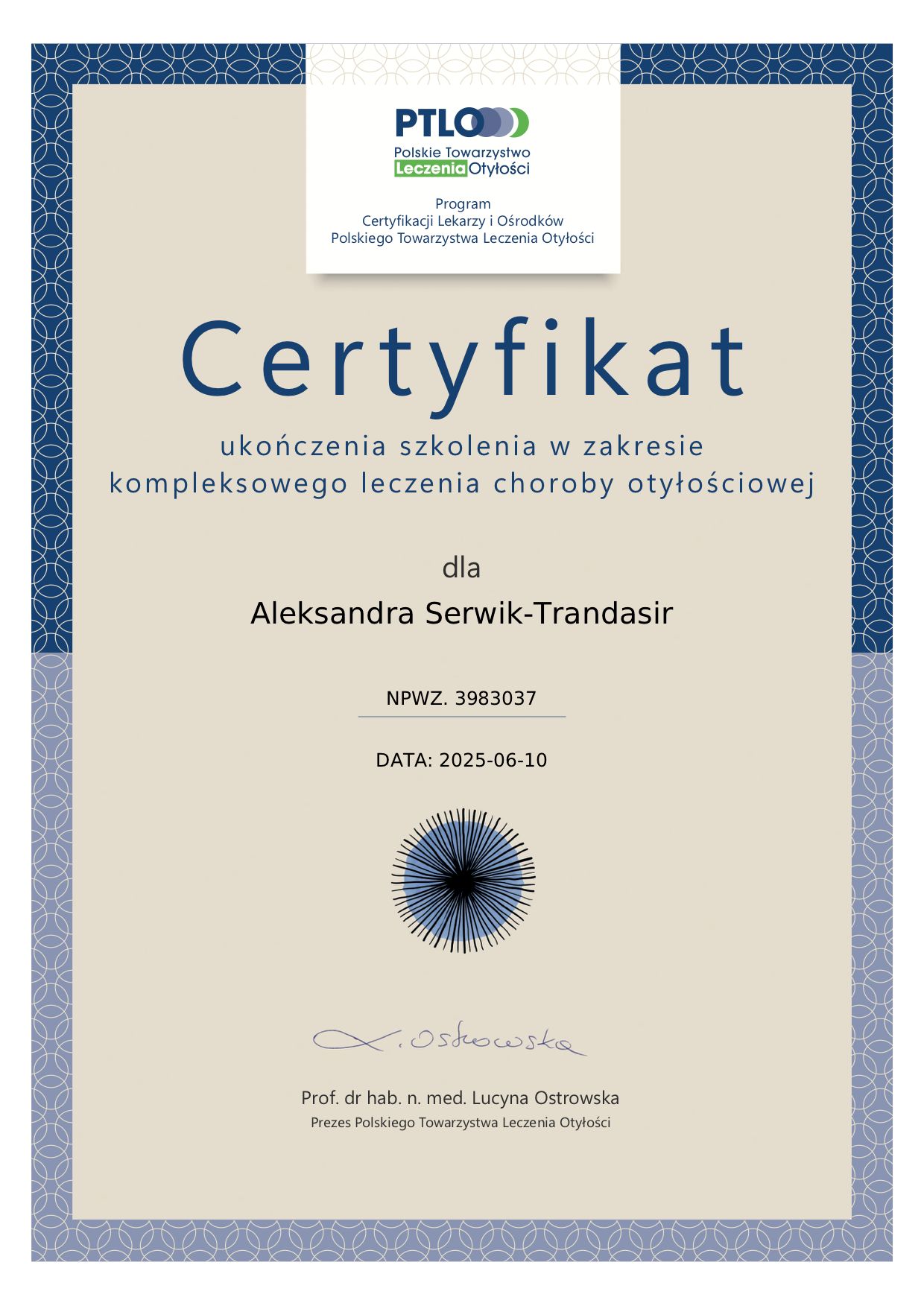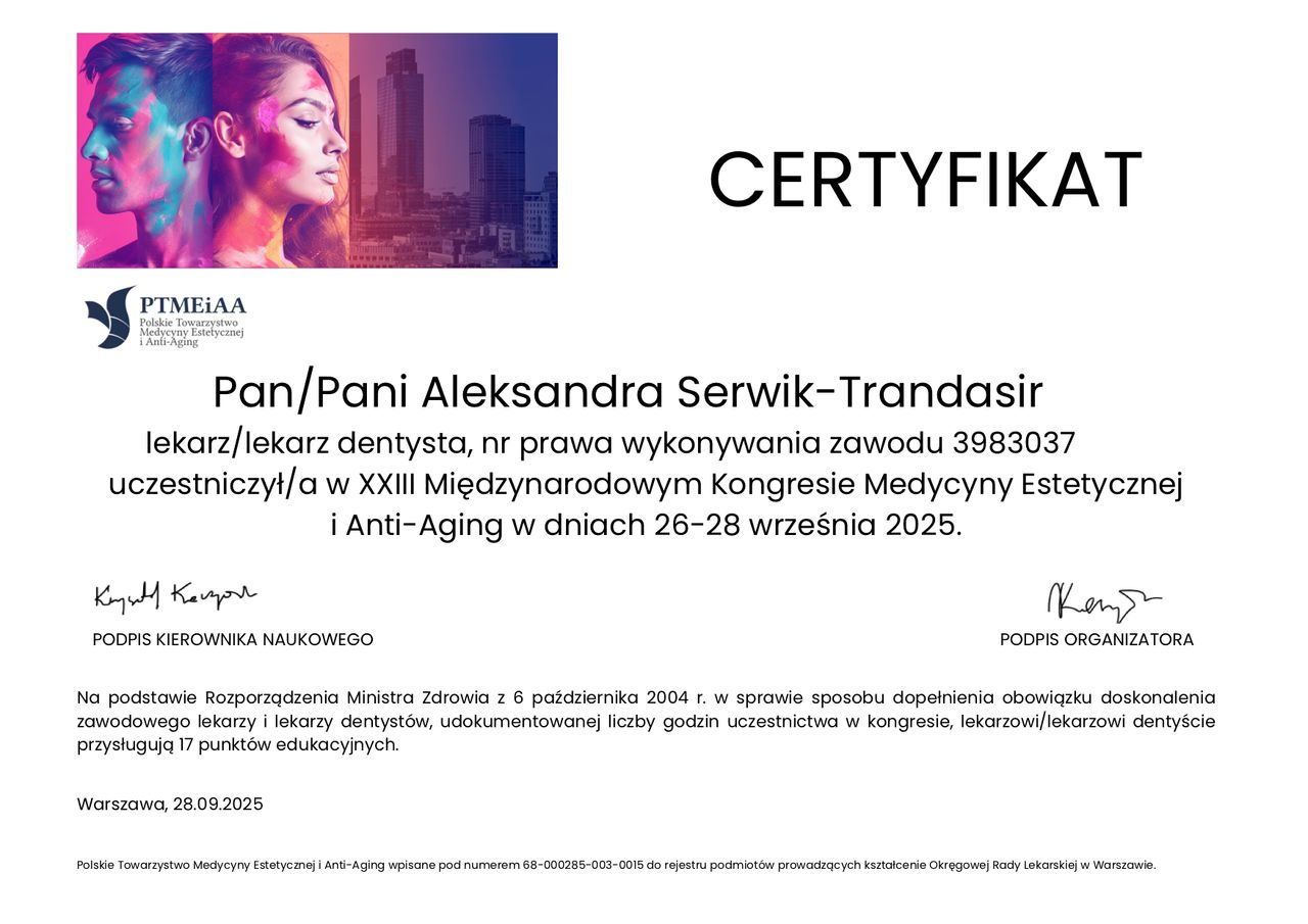 Nazywam się Aleksandra Serwik-Trandasir i jestem lekarką. Ukończyłam kierunek lekarski na Warszawskim Uniwersytecie Medycznym oraz kosmetologię na Uniwersytecie Medycznym w Łodzi (studia licencjackie oraz magisterskie). Obecnie jestem w trakcie rezydentury z Medycyny Rodzinnej.