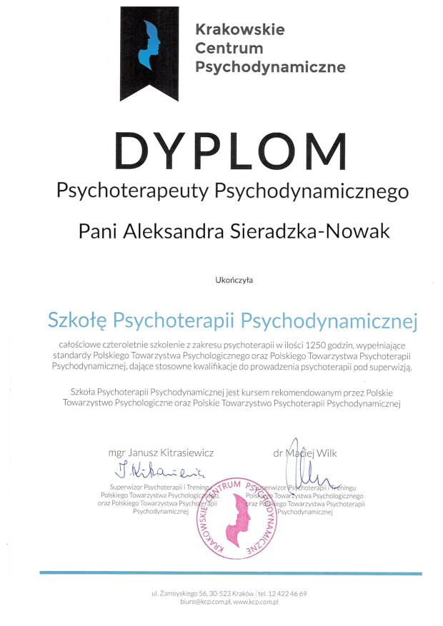 Dzień dobry! Jestem psychoterapeutą psychodynamicznym. Ukończyłam szkołę psychoterapii w Krakowskim Centrum Psychoterapii. Posiadam wykształcenie psychologiczne oraz pedagogiczne. Studiowałam psychologię, surdopedagogikę, oligofrenopedagogikę oraz polonistykę. Doświadczenie zawodowe poprzedziłam praktykami na Oddziałe Leczenia Zaburzeń Osobowości i Nerwic w Szpitalu Klinicznych im. Józefa Babińskiego oraz na Oddziale Klinicznym Psychiatrii Dorosłych, Dzieci i Młodzieży Szpitala Uniwersyteckiego w Krakowie. Współpracowałam z Krakowską Fundacją Hamlet, która zajmuje się opieką dzienną osób leczących się psychiatrycznie. Ponadto pracowałam w Domu Pomocy Społecznej w Krakowie zajmującym się osobami wymagającymi stałej opieki psychiatrycznej. Stale współpracuję z Polskim Towarzystwem Walki z Mukowiscydozą, gdzie pracuję z rodzinami lub ich członkami chorymi przewlekle. Prowadzę zajęcia ze studentami w Wyższej Szkołe Biznesu - National Louis University w Nowym Sączu. Swoją pracę poddaję superwizji grupowej oraz indywidualnej. Współpracuję z zespołem psychologów i psychoterapeutów, wymieniając się wiedzą i doświadczeniem. W swojej pracy współpracuję także z lekarzem psychiatrą. Uczestniczę w szkoleniach podnosząc swoje kwalifikacje.