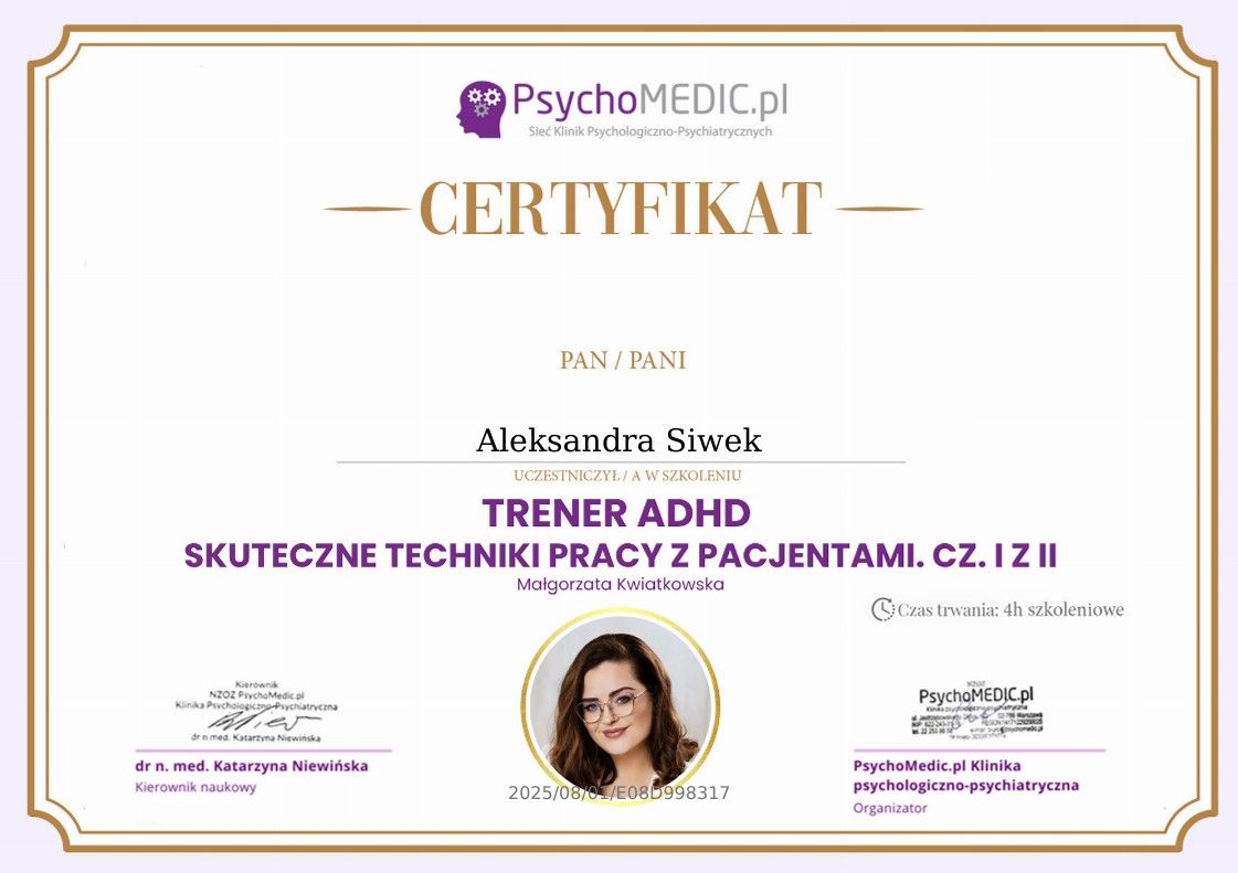 Czy Aleksandra Siwek przyjmuje online, bez konieczności pojawiania się w placówce?Tak, Aleksandra Siwek oferuje konsultacje online. Wybierz opcję „konsultacja online” przy umawianiu wizyty, a zobaczysz dostępne terminy.