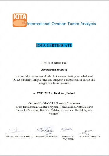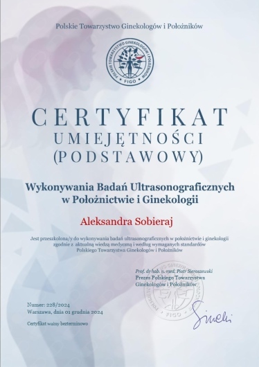 W kręgu moich zainteresowań znajduje się diagnostyka ultrasonograficzna, która stanowi nieocenione narzędzie w monitorowaniu zdrowia pacjentek i ich dzieci .Wiedzę w zakresie uroginekologii poszerzałam na specjalistycznych kursach m.in. Uroginekologia Praktyczna prof. dr hab.n.med. Ewy Barcz oraz szkoleniach dr Jacka Kociszewskiego. Jestem aktywnym członkiem PTGiP oraz posiadam Certyfikat Umiejętności Wykonywania Badań Ultrasonograficznych w Położnictwie i Ginekologii PTGiP oraz certyfikat International Ovarian Tumor Analysis. W wolnym czasie pasjonuję się podróżowaniem – odkrywanie nowych kultur, smaków i miejsc inspiruje mnie i pozwala naładować energię, którą z radością wykorzystuję w codziennej pracy. Jeśli poszukujesz lekarza sumiennego i dokładnego , ze znajomością języka angielskiego lub niemieckiego zapraszam na konsultację.