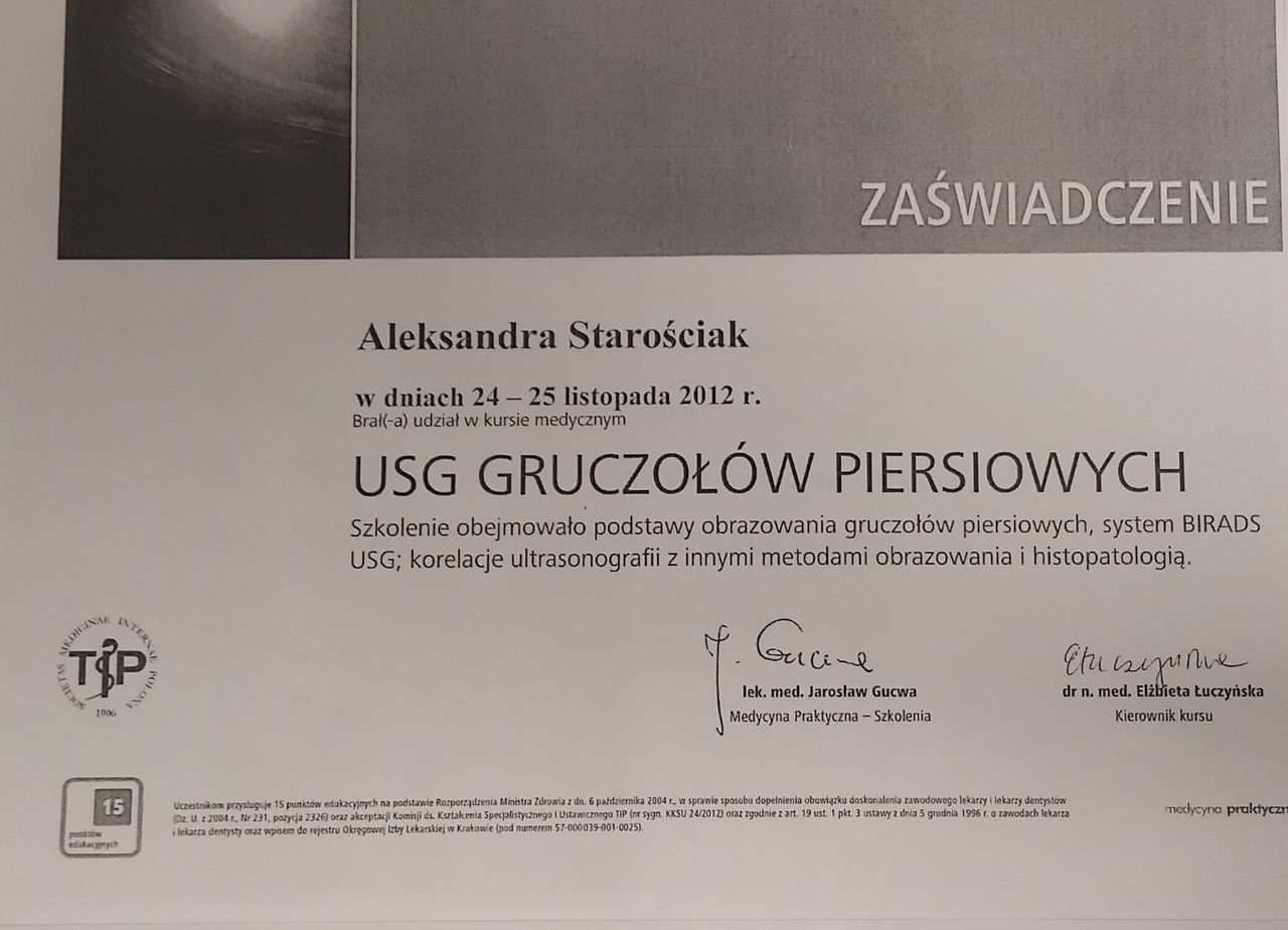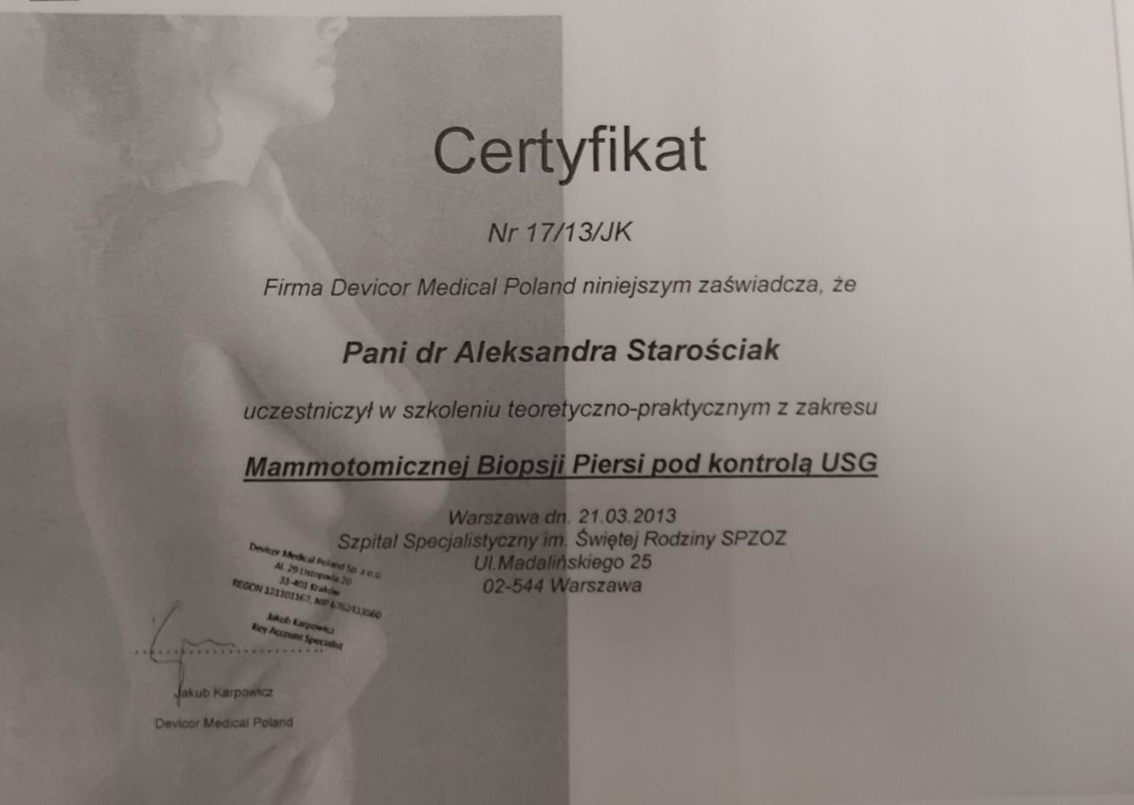 Trafiłam do pani doktor z polecenia innego lekarza i bardzo się cieszę, że prowadzi moje leczenie. Przyszłam na wizytę z 2 cm guzkiem piersi zdefiniowanym wcześniej jako FA. Pani doktor przeprowadziła u mnie zabieg biopsji mammotomicznej - usuwając guzka w całości. Zabieg mimo, że stresujący z natury, został przeprowadzony w bardzo przyjemnej i profesjonalnej atmosferze. Czułam się zaopiekowana i wszystko zostało mi wyjaśniane na bieżąco. Czekam teraz na wynik badania histopatologicznego i czuję, że jestem w dobrych rękach :). Bardzo, bardzo polecam. Pani doktor emanuje profesjonalizmem, empatią, ma też poczucie humoru, które rozładowuje napięcie i moim zdaniem jest bardzo potrzebne w tak delikatnych tematach.
