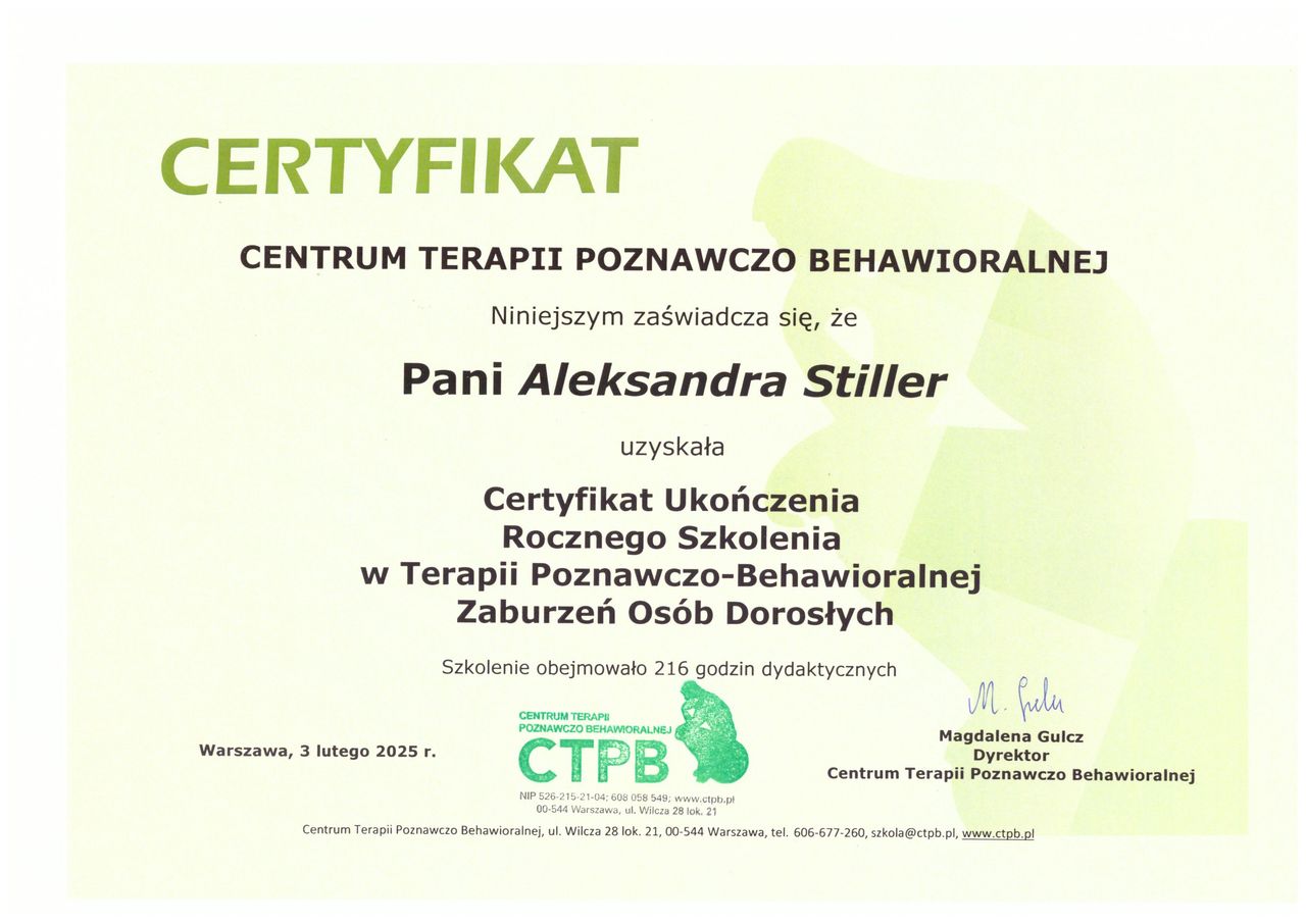 Nazywam się Aleksandra Stiller. Jestem magistrem psychologii i psychoterapeutką w trakcie szkolenia w nurcie poznawczo-behawioralnym (CBT).