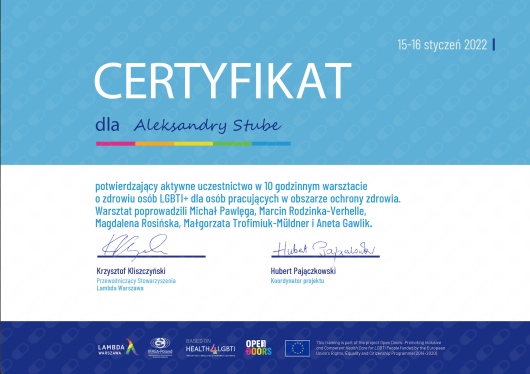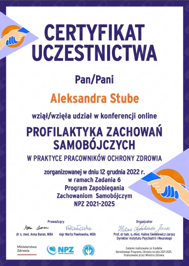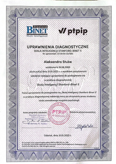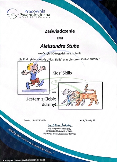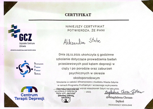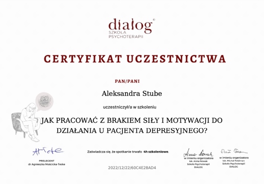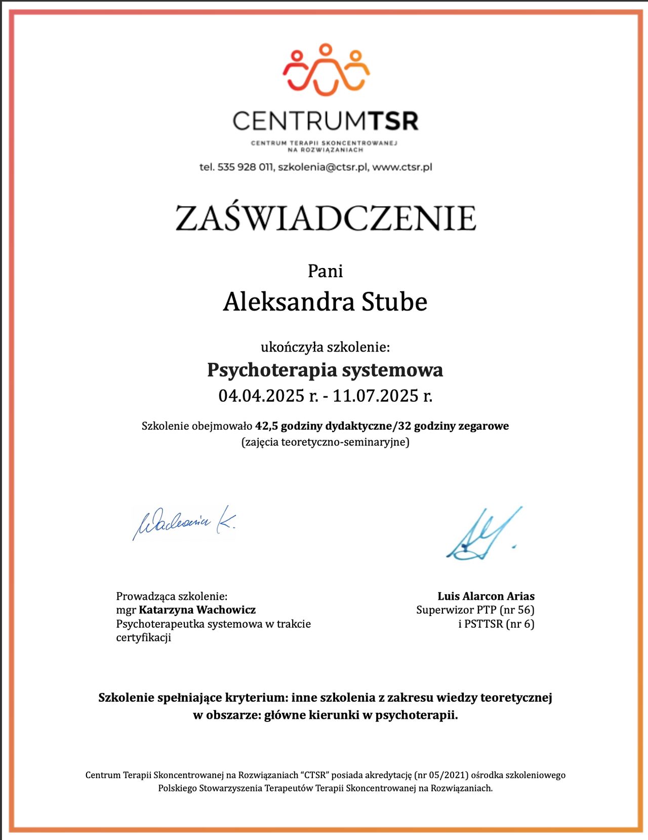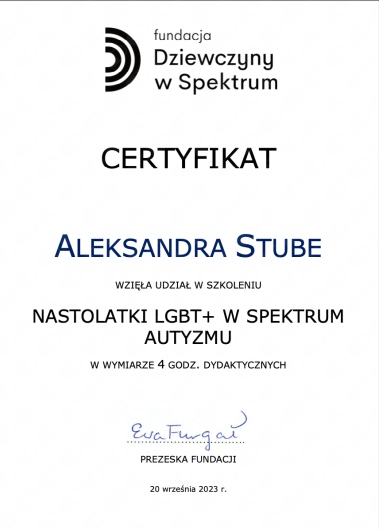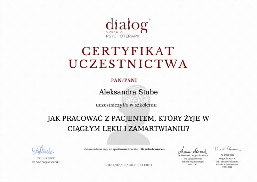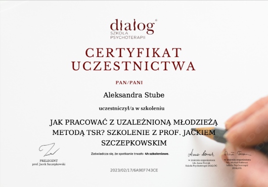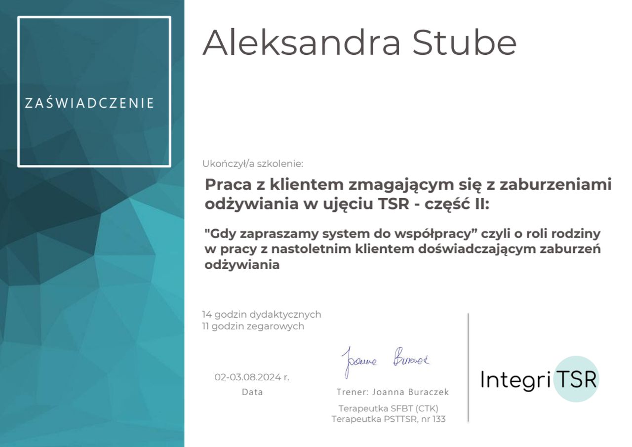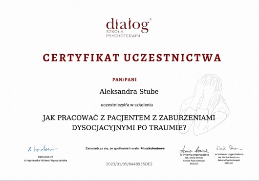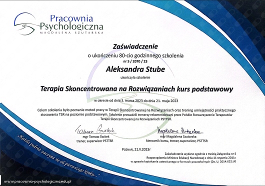 Jestem również w procesie kształcenia: seksuologicznego w ramach studiów podyplomowych na kierunku Seksuologia Kliniczna na Uniwersytecie SWPS oraz psychoterapeutycznego w nurcie Terapii Skoncentrowanej na Rozwiązaniach: ukończyłam stopień podstawowy, zaawansowany oraz przygotowanie do pracy metodą Kids’ Skills (praca z dziećmi i młodzieżą), aktualnie odbywam ponad 400 godzin szkoleń zarówno w tym nurcie, jak i tych pochodnych (np. terapia systemowa, ericksonowska). Dodatkowo swoją edukację wciąż uzupełniałam licznymi szkoleniami i kursami z innych nurtów terapeutycznych oraz zakresu diagnostyki i interwencji kryzysowej.