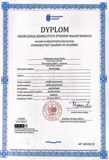 Ukończyłam studia magisterskie na Uniwersytecie Gdańskim o kierunku psychologia ze specjalnościami kliniczną oraz dzieci i młodzieży.