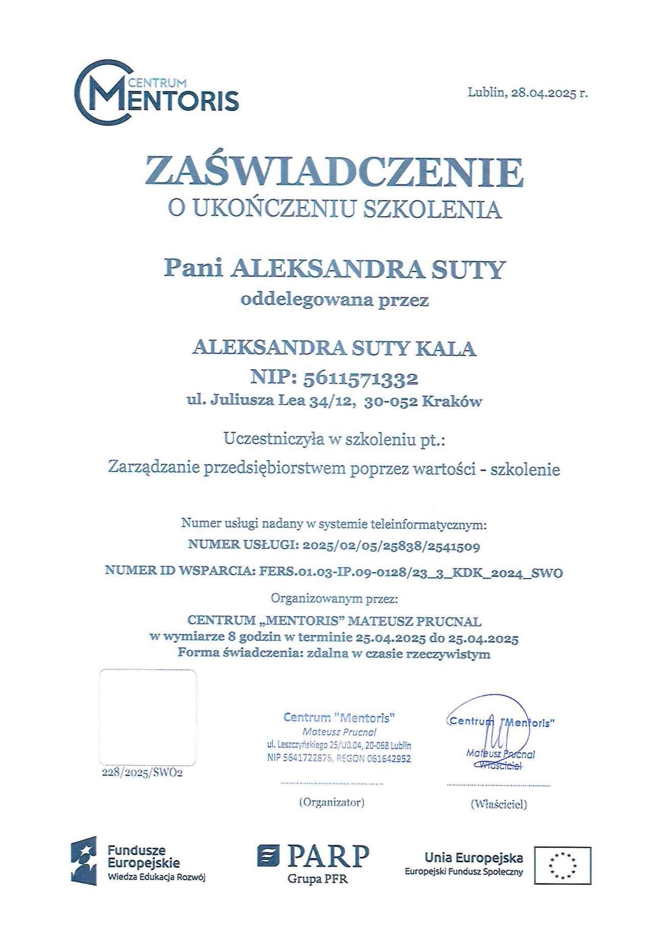 - szkolenie "Zarządzanie poprzez wartości", Centrum Mentoris (2025),