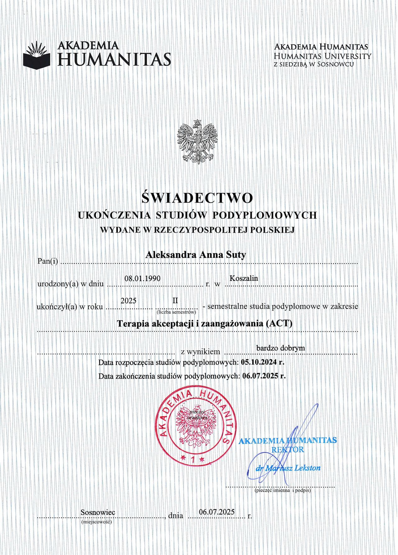 - studia podyplomowe "Terapia ACT dla specjalistów", Akademia Humanitas, (2024-2025)