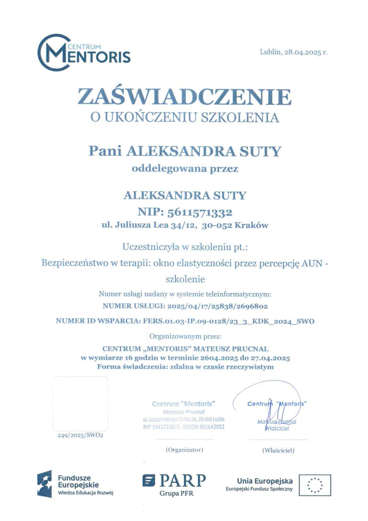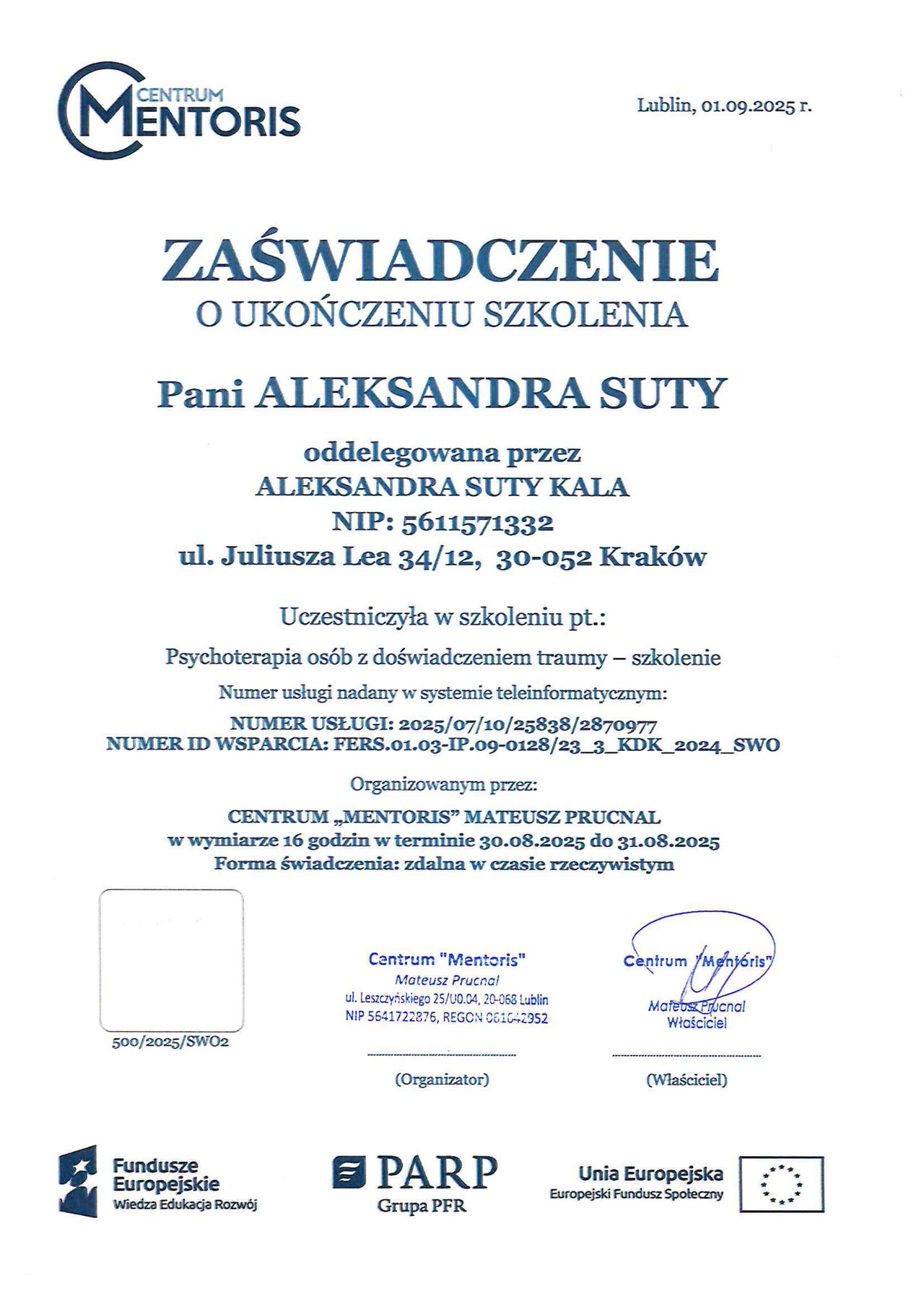 - szkolenie "Psychoterapia osób z doświadczeniem traumy", Centrum Mentoris (2025),