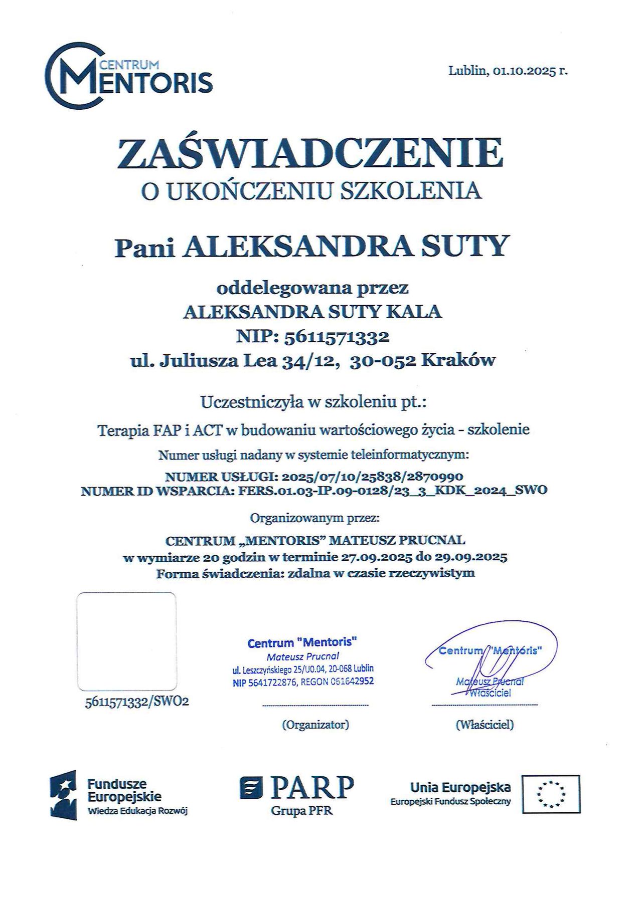 - szkolenie "Terapia FAP i ACT w budowaniu wartościowego życia, Centrum Mentoris (2025),