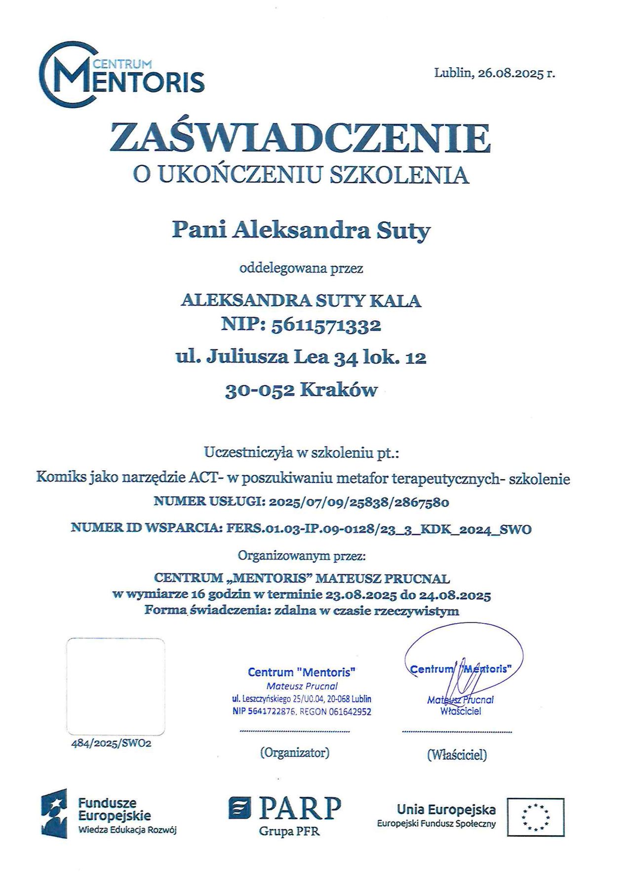 - szkolenie "Komiks jako narzędzie ACT - w poszukiwaniu metafor terapeutycznych", Centrum Mentoris (2025),