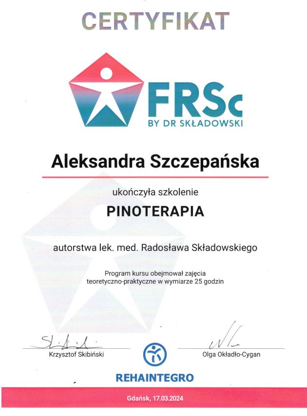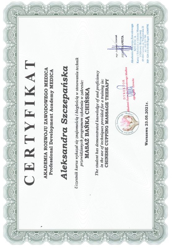 Jaki jest zakres porad oferowanych przez Aleksandra Szczepańska?Aleksandra Szczepańska to fizjoterapeuta. Na podstawie swojego doświadczenia i wykształcenia Aleksandra Szczepańska oferuje usługi takie jak: Fizjoterapia pourazowa, konsultacja fizjoterapeutyczna, masaż Kobido, fizjoterapia, Fizjoterapia (pierwsza wizyta), Trening medyczny.
