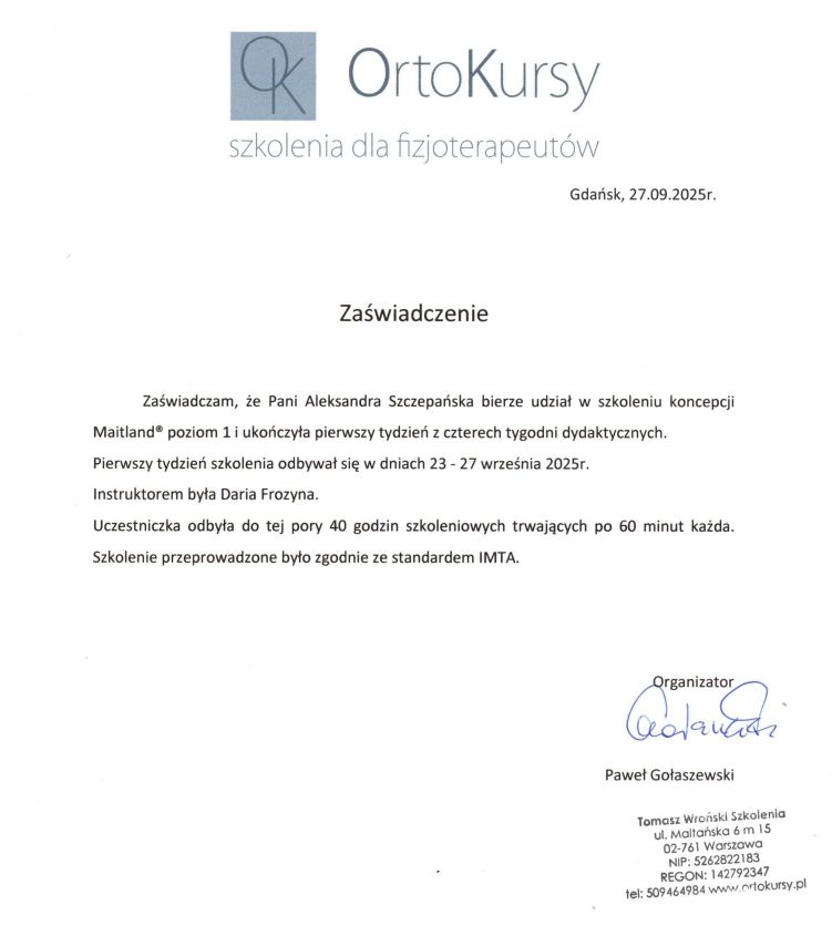 Jestem dyplomowaną fizjoterapeutką i absolwentką Gdańskiego Uniwersytetu Medycznego. W swojej pracy wspieram pacjentów w powrocie do pełnej sprawności po zabiegach ortopedycznych i kontuzjach, oraz z bólami stawów i kręgosłupa.
