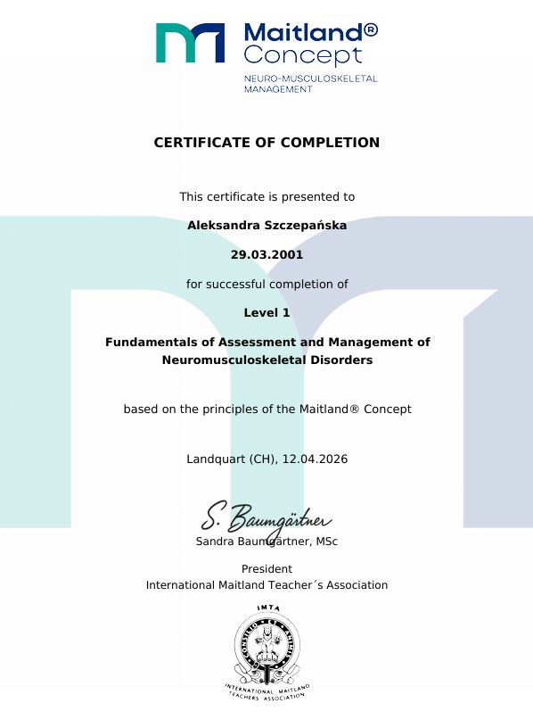 Dużą wagę przykładam do edukacji opowiadając o istocie problemu, prawdopodobnych przyczynach i mechanizmach, postępowaniu terapeutycznym i spodziewanych efektach terapii, oraz zgodnie z wiedzą naukową i swoim doświadczeniem odpowiadam na wszelkie pytania pacjenta. Dodatkowo tworzę treści edukacyjne w social mediach, gdzie dziele się swoją wiedzą i pasją do fizjoterapii.