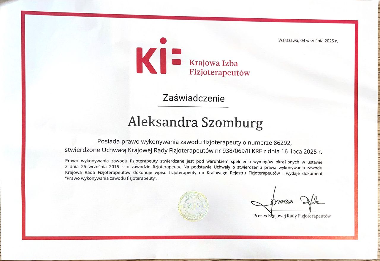 Szczerze polecam panią Aleksandrę- fizykoterapeutę. Trafiłam z ciasnotą przy barkową i krętarzem bioder. Już po drugiej wizycie odczułam wyraźną poprawę. Terapia pani Aleksandry jest skuteczna i dopasowana indywidualnie z prowadzoną dużą wiedzą oraz wyczuciem miejsca bólu. Widać doświadczenie i zaangażowanie w taki sposób aby mi pomóc w codziennym zmaganiem się bólu. Ponadto przyjazna, komunikatywna i elastyczna poprostu rozumie pacjenta . Polecam .