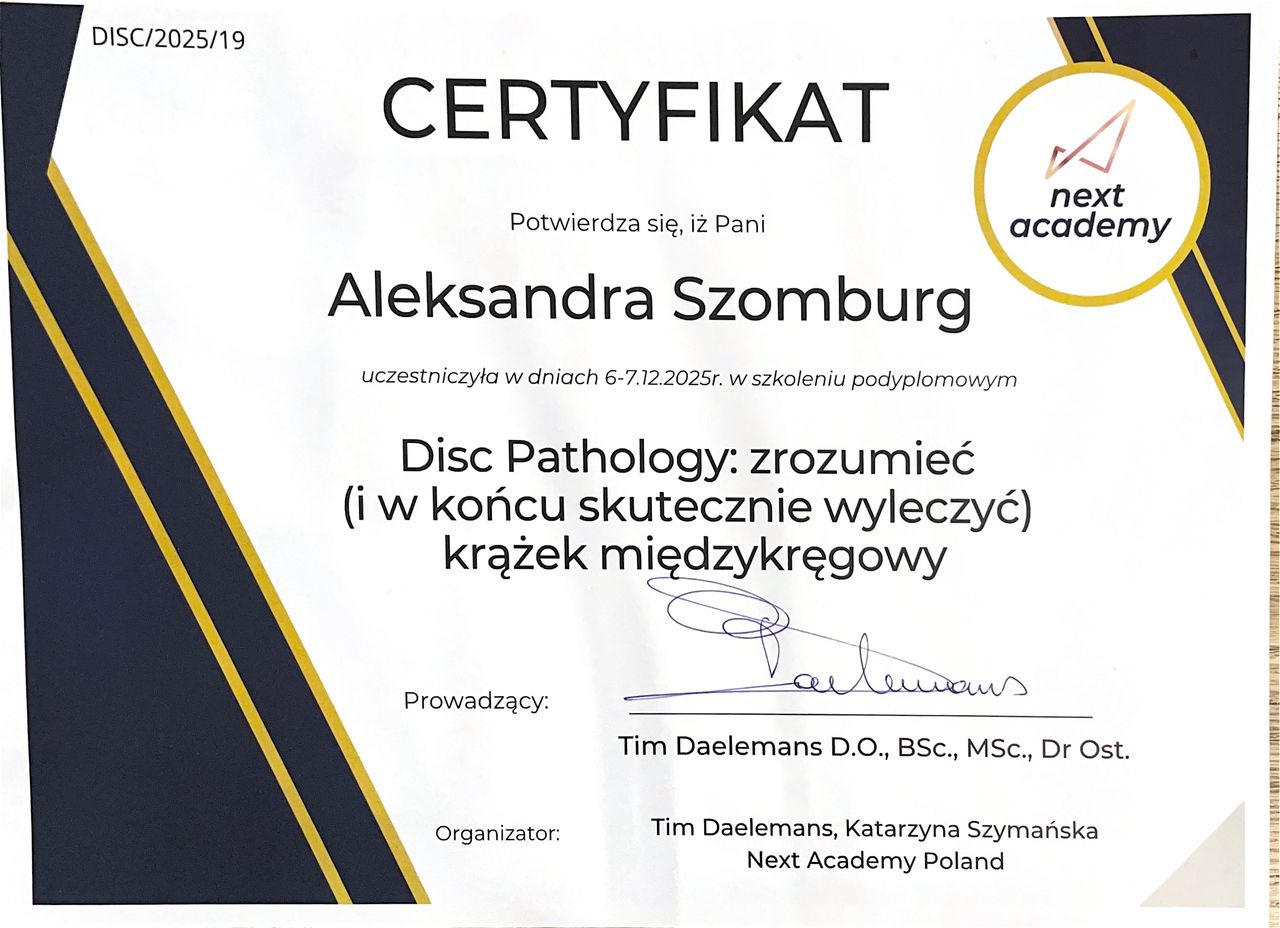 Jestem absolwentką Gdańskiego Uniwersytetu Medycznego, gdzie uzyskałam tytuł magistra fizjoterapii. Swoje umiejętności stale podnoszę poprzez udział w kursach fizjoterapeutycznych. Obecnie szkolę się w zakresie terapii manualnej według koncepcji Maitland, która opiera się na połączeniu dokładnej diagnostyki klinicznej z indywidualnie dobranymi metodami leczenia nerwowo-mięśniowo-szkieletowych dysfunkcji układu ruchu.
