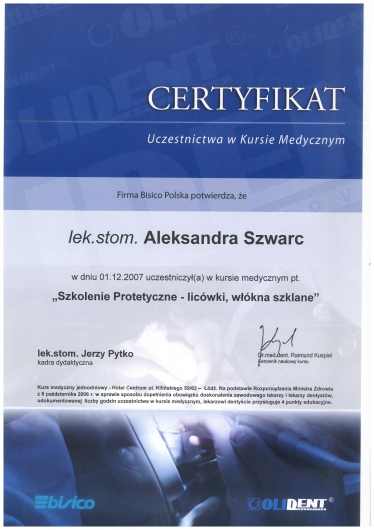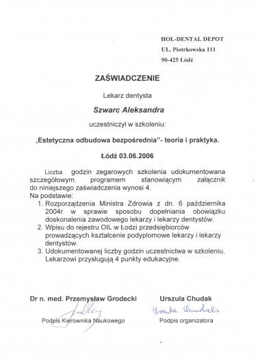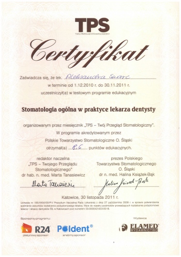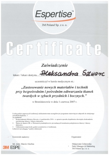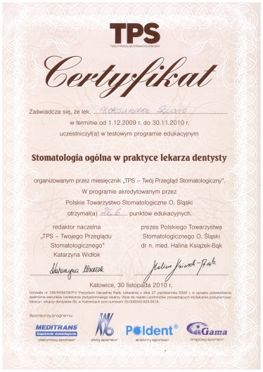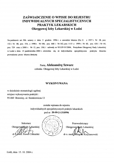 Specjalizacja z zakresu stomatologii ogólnej, liczne kursy i szkolenia pozwalają mi na ciągłe podnoszenie swoich kwalifikacji.