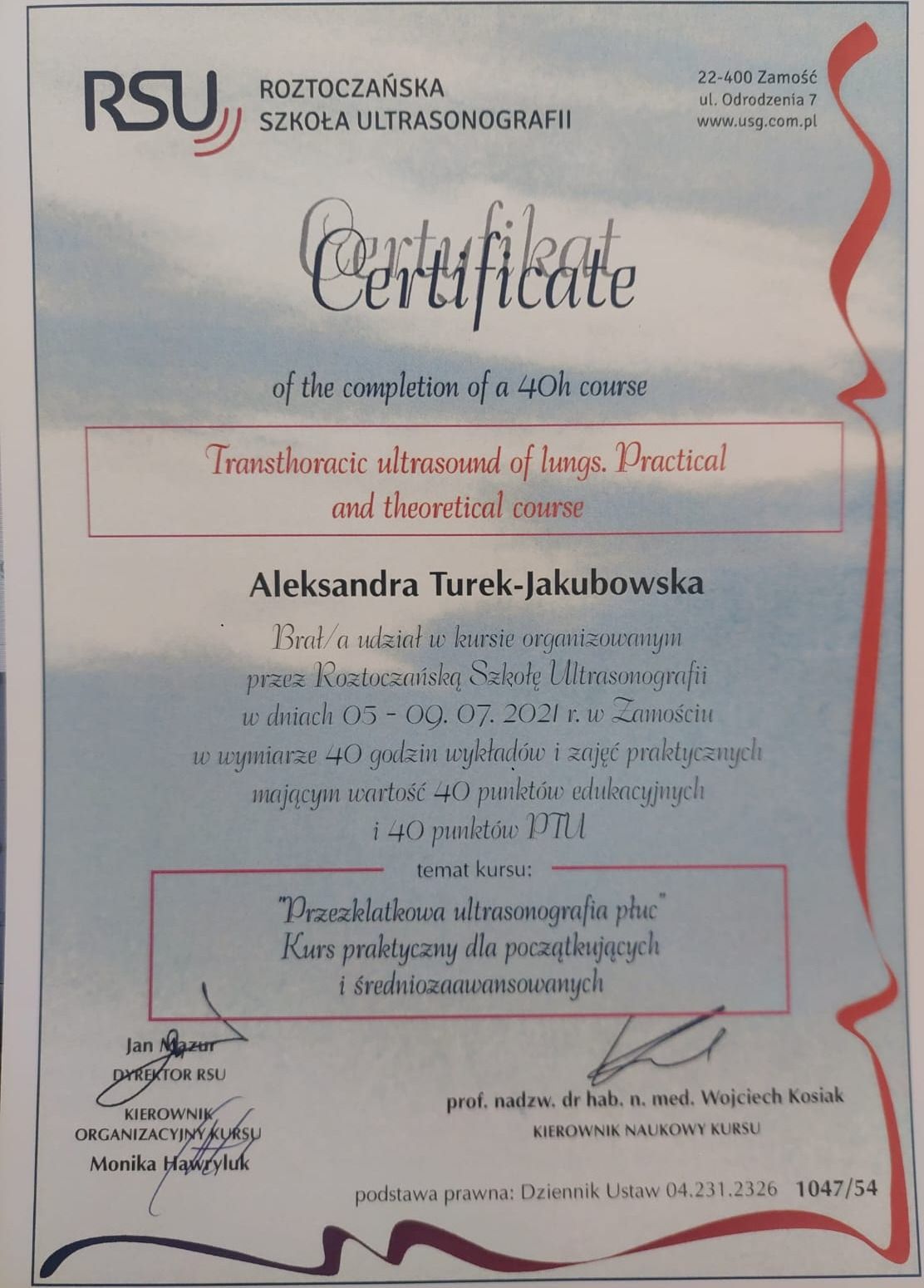 Konsultacja lekarska ze szczegółowym omówieniem dolegliwości mojej mamy, wizyta bez zbędnego pośpiechu, z dokładnymi zaleceniami co do dalszego leczenia w formie pisemnej.Pani doktor posiadała też kserokopie ćwiczeń oddechowych, które rozszerzyły moją wiedzę i możemy je wdrożyć do codziennej rutyny.Bardzo polecam każdemu Doktor Aleksandrę Turek-Jakubowskà.