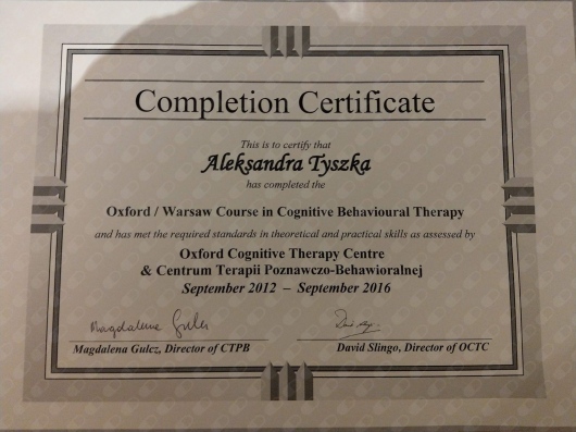 Jestem psychologiem, certyfikowanym psychoterapeutą Terapii Poznawczo - Behawioralnej akredytowanym przez Centrum Poznawczo - Behawioralnej w Warszawie oraz Oxford Cognitive Therapy Centre. Głównym obszarem moich zainteresowań jest terapia poznawczo – behawioralna, oraz terapia schematu, jednak w pracy z klientem korzystam także z podejścia systemowego czy psychodynamicznego. Wierzę, że każdy człowiek jest wyjątkowy, a więc także metody pracy powinny być dostosowane do charakteru i potrzeb pacjenta, tak aby dobrana metoda była optymalną forma pomocy. Planując pracę z klientem korzystam nie tylko ze swojej wiedzy psychoterapeutycznej, ale i biologicznej. Jestem bowiem przekonana, iż jedynie całościowe spojrzenie na pacjenta pozwala na postawienie trafnej diagnozy i dobór odpowiedniej metody pracy. Pracuje zgodnie z kodeksem etycznym psychoterapeuty. Swoją pracę poddaję superwizji. Aby podnieść swoje kompetencje oraz świadczyć usługi zgodne z nowoczesnymi standardami pracy z pacjentem regularnie odbywam szkolenia w zakresie psychoterapii. Jestem członkiem Polskiego Towarzystwa Psychologi Poznawczo - Behawioralnej.