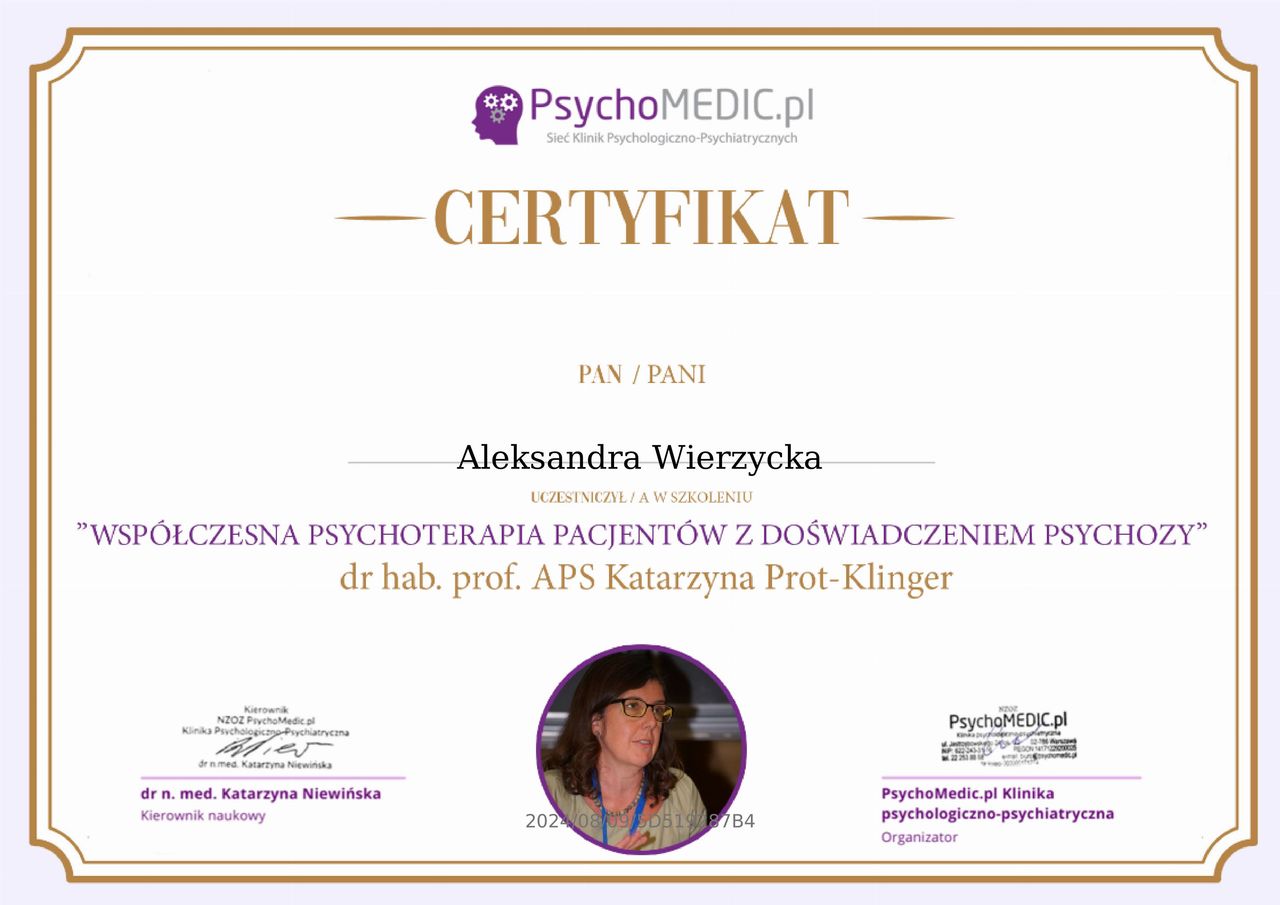 Czy Aleksandra Wierzycka przyjmuje online, bez konieczności pojawiania się w placówce?Tak, Aleksandra Wierzycka oferuje konsultacje online. Wybierz opcję „konsultacja online” przy umawianiu wizyty, a zobaczysz dostępne terminy.